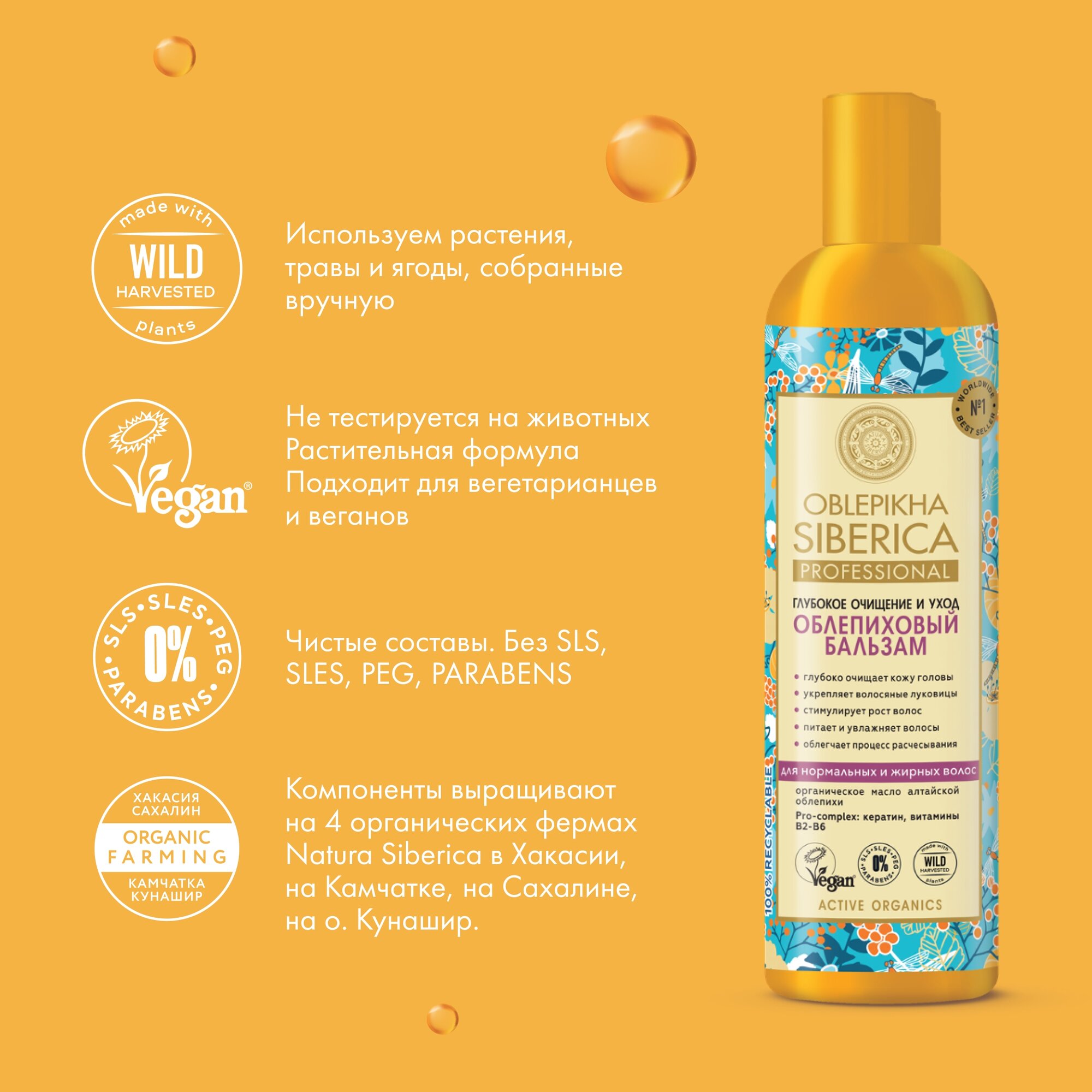 Бальзам с нежной текстурой мягко ухаживает за волосами по всей длине, делая их более сильными и крепкими. Средство не только оказывает комплексное воздействие на волосы, но и предупреждает их ломкость и спутывание, способствует росту волос. Органическое масло алтайской облепихи и марокканское масло арганы источники жирных кислот Омега 3,6,9 и редкой Омега 7, ответственных за здоровье и красоту волос. Экстракт курильского бамбука укрепляет и защищает волосы и способствует их активному росту. Экстракт женьшеня сибирского, содержащий витамины, макро- и микроэлементы, оказывает тонизирующее и укрепляющее действие на волосы. Биотин пробуждает спящие волосяные луковицы, ускоряя тем самым процесс роста волос. Кофеин активизирует клеточный метаболизм, способствуя уменьшению выпадения волос.