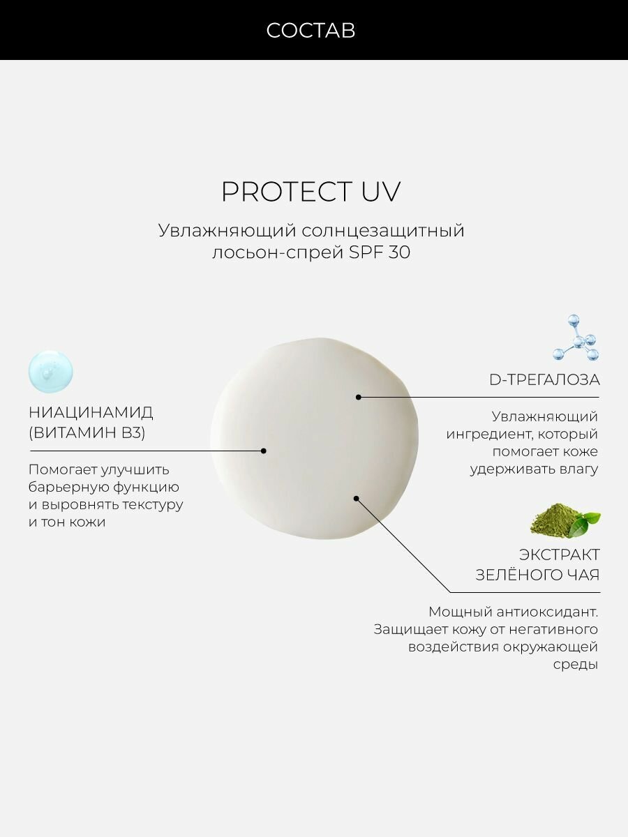 Ни о чем не беспокойтесь, находясь на солнце, с этим универсальным увлажняющим спреем с защитой широкого спектра действия SPF 30. Шелковисто-гладкий по текстуре и легко впитывающийся Увлажняющий солнцезащитный лосьон-спрей SPF 30 Protect UV помогает защитить кожу от вредоносных лучей UVA и UVB, которые могут повредить кожу и привести к преждевременному появлению признаков старения. Этот питательный солнцезащитный спрей, содержащий ниацинамид, D-трегалозу и экстракт зелёного чая, окутывает кожу тонкой легчайшей дымкой и мгновенно впитывается в кожу, не оставляя нежелательного белого налета. Формула, богатая витаминами и достаточно мягкая для использования как на лице, так и на теле, помогает защитить кожу от негативного воздействия внешних факторов, таких как загрязнения воздуха. Спрей не содержит спирта и масел, закупоривающих поры. А естественное покрытие делает его незаменимым выбором для повседневного использования. Продукт идеально подходит для всех типов кожи.