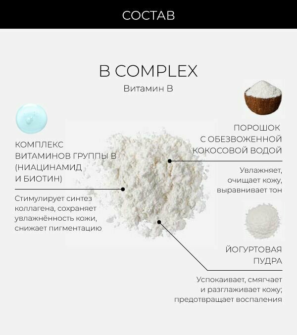 Кристаллическая пудра Витамин B-комплекс — это омолаживающий, успокаивающий кожу порошок-бустер с ниацинамидом (витамин B3) и биотином, разработанный для лёгкого смешивания с вашей любимой сывороткой или увлажняющим кремом, чтобы помочь осветлить тон, восстановить гидробарьер кожи и добавить необходимых витаминов в ваш ежедневный уход за кожей. Балансирует микробиом кожи, помогает очистить кожу, улучшить её тон и текстуру, поддерживает здоровую и сбалансированную защитную функцию кожи, наполняет кожу влагой, обеспечивая длительное увлажнение. Кожа кажется несбалансированной, безжизненной или тусклой? Повысьте эффективность вашего повседневного ухода и придайте коже жизненных сил с помощью сверхувлажняющего В-комплекса, который мгновенно повышает эффективность вашей любимой сыворотки и увлажняющего крема! Эти совершенствующие кожу кристаллы, содержащие комплекс витамина B (особая смесь 10% ниацинамида и биотина) и кокосовый порошок, помогают очистить и сбалансировать кожу, способствуя более ровному тону. Питательная йогуртная пудра успокаивает и смягчает кожу, делая её более гладкой и эластичной.