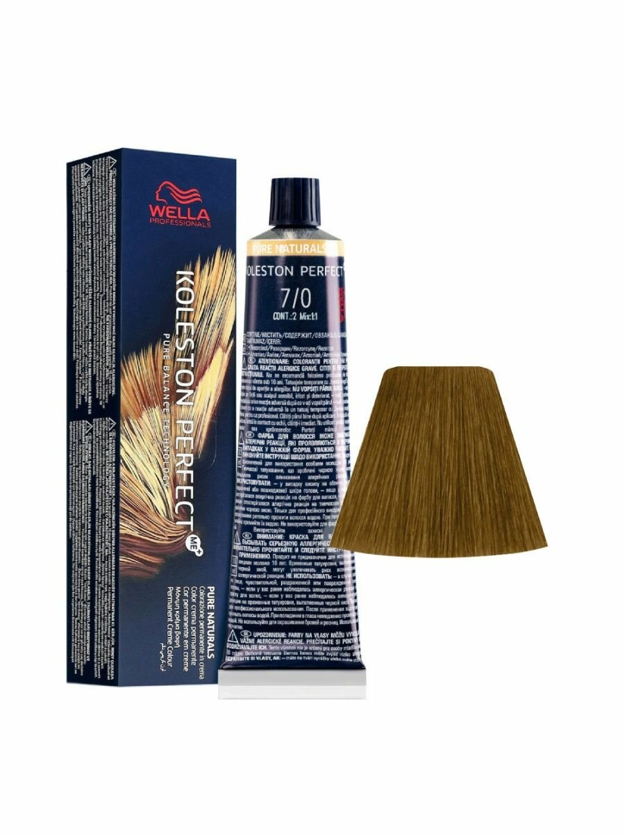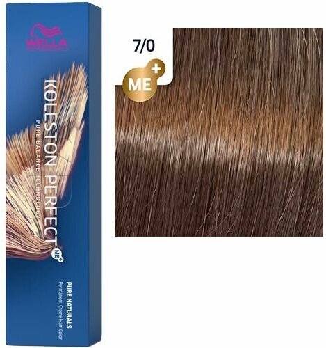 Koleston Perfect ME+ Крем-краска cтойкая 7/0 Блонд натуральный 60 мл. Действие красителя основано на технологии Pure Balance. Она нейтрализует частицы металлов, которые присутствуют в волосах, тем самым защищает волосы от свободных радикалов. Из-за этого некоторые оттенки во время окислительного процесса могут выглядеть иначе. Не беспокойтесь – результат окрашивания будет полностью соответствовать вашим ожиданиям.Обеспечивает чистый, сбалансированный цвет с естественной глубиной и блеском.Благодаря молекуле ME+ вероятность возникновения аллергии снижается до 60 раз, а Pure Balance Technology обеспечивает значительно меньшее повреждение волос после каждого окрашивания.Pure Balance технология нейтрализует частички металла. Способствует укреплению связей в структуре волоса и формированию предсказуемого - желаемого оттенка волос.У краски простая пропорция смешивания 1:1, покрытие седины до 100 % и 3 уровня осветления.Состояние волос.По сравнению с предыдущей версией Koleston Perfect Me+ защищает волосы от повреждения. Технология Pure Balance позволяет выглядеть им здоровыми и блестящими окрашивание за окрашиванием. Благодаря ухаживающему эффекту краситель подходит для быстрого сервиса ламинирования волос. Для этого смешайте KP Me+, Welloxon Perfect и стабилизатор окрашивания Invigo в равных пропорциях и выдержите 5-10 минут.Результат:Превосходное состояние волос, увеличенный процент светоотражения, интенсивный блеск по всей длине.Способ применения: Cмешайте краску с окислителем Welloxon Perfect в пропорции 1:1.Равномерно нанесите полученную смесь на чистые, влажные волосы по всей длине, уделяя особое внимание корням волос и кончикам.Оставьте для воздействия на 30-40 минут без тепла, 15-25 минут с теплом.Смойте остатки краски водой.