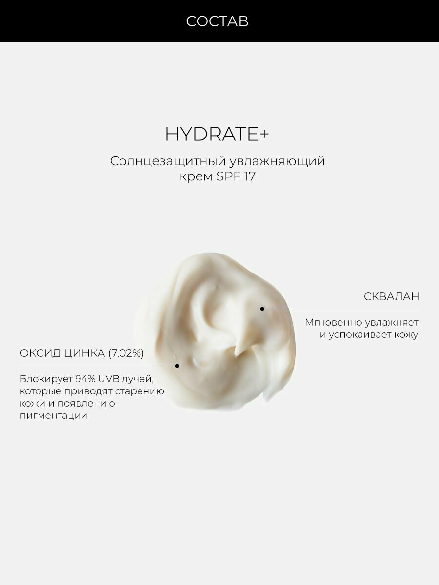 | Способ применения | Очистите и тонизируйте кожу. Нанесите порцию Крема SPF 17 HYDRATE+ на кожу лица, шеи, декольте и рук за 15 минут до выхода на солнце. Повторяйте нанесение не реже, чем каждые 2 часа. Идеально подходит в качестве базы под макияж. |