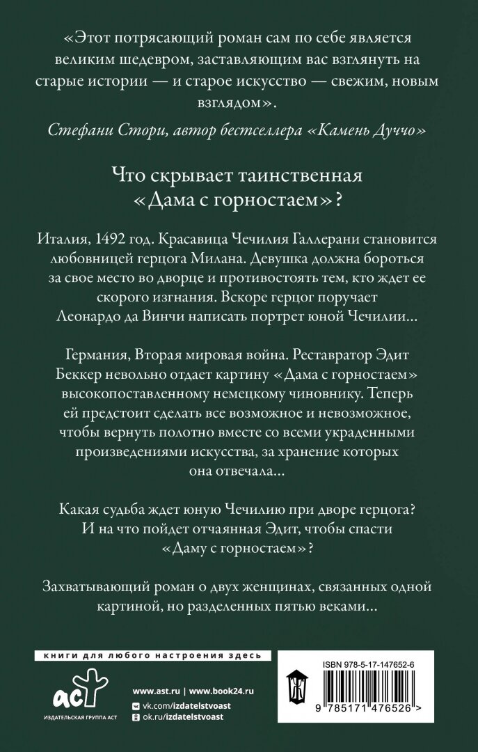 Что скрывает таинственная "Дама с горностаем"?Италия, 1492 год. Красавица Чечилия Галлерани становится любовницей герцога Милана. Девушка должна бороться за свое место во дворце и противостоять тем, кто ждет ее скорого изгнания. Вскоре герцог поручает Леонардо да Винчи написать портрет юной Чечилии…Германия, Вторая мировая война. Реставратор Эдит Беккер невольно отдает картину "Дама с горностаем" высокопоставленному немецкому чиновнику. Теперь ей предстоит сделать все возможное и невозможное, чтобы вернуть полотно вместе со всеми украденными произведениями искусства, за хранение которых она отвечала…Какая судьба ждет юную Чечилию при дворе герцога? И на что пойдет отчаянная Эдит, чтобы спасти "Даму с горностаем"?Захватывающий роман о двух женщинах, связанных одной картиной, но разделенных пятью веками…