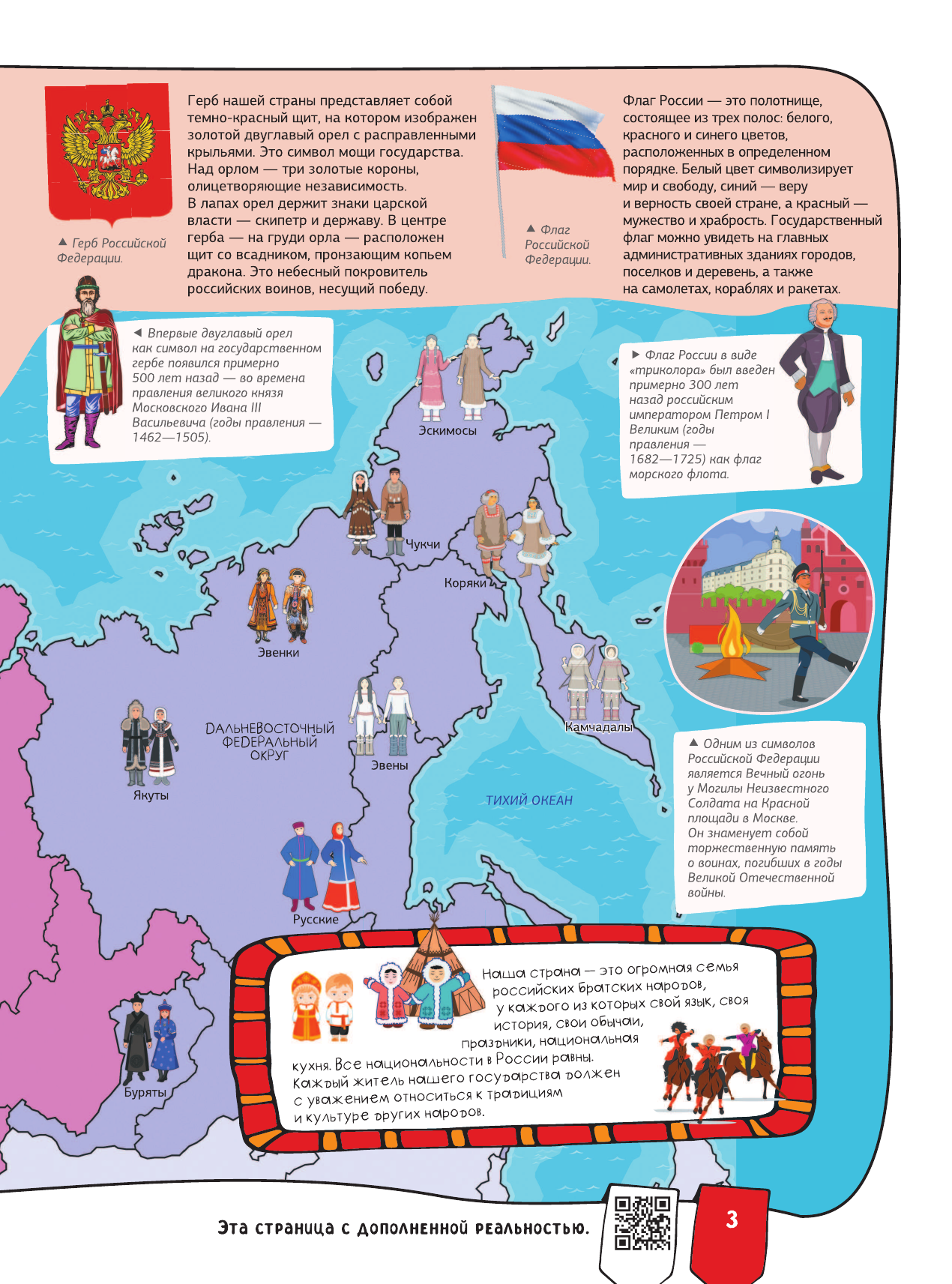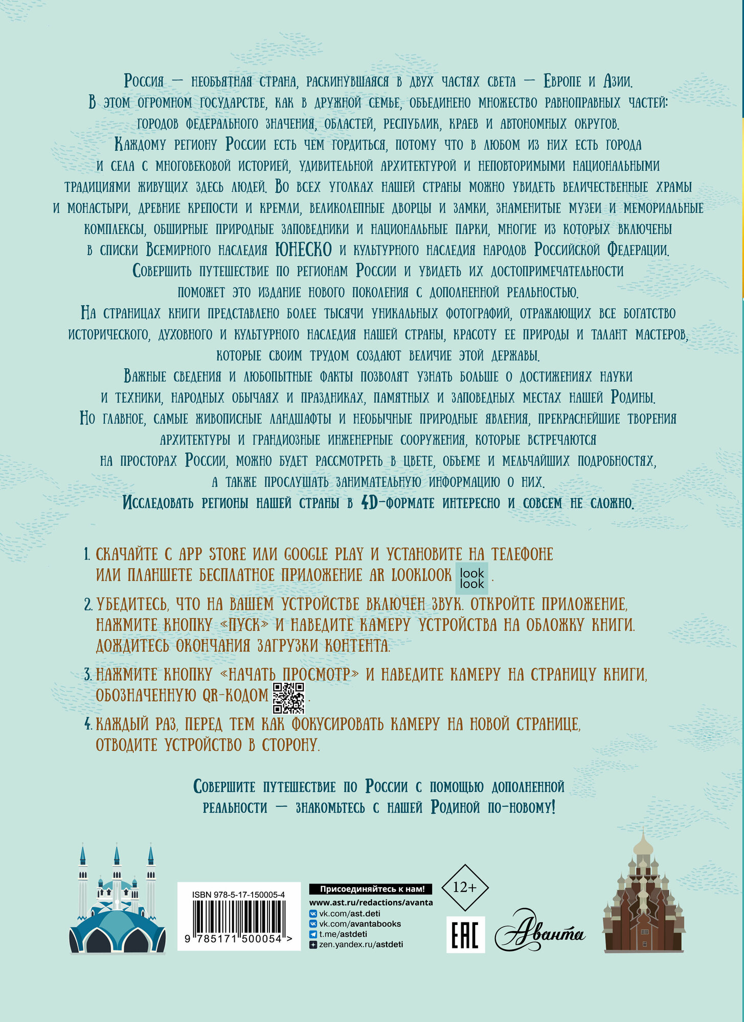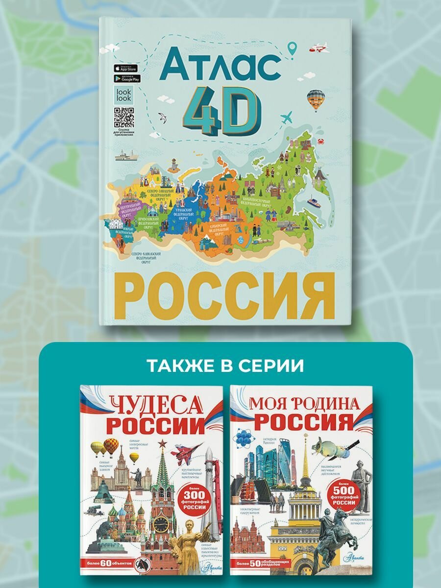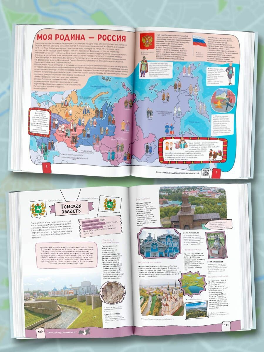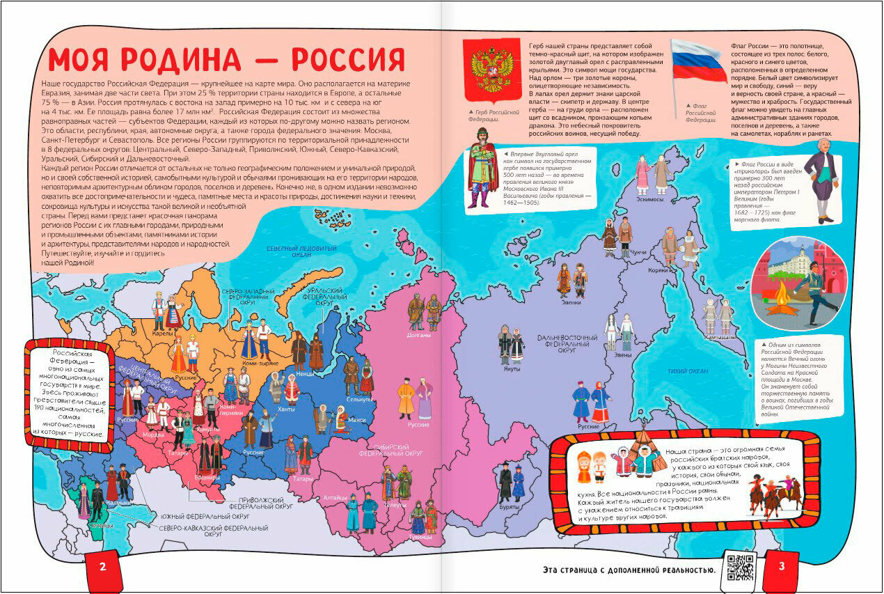 Эта книга нового поколения с дополненной реальностью приглашает отправиться в увлекательное путешествие по необъятной России. Вы познакомитесь с республиками, областями и краями Российской Федерации, с ее главными городами и достопримечательностями, древними и современными архитектурными сооружениями, крупнейшими музеями и национальными парками, заповедными местами и природными чудесами. Издание расскажет юным читателям много нового о достижениях науки и техники, самобытной истории и культуре, народных традициях и праздниках в различных регионах нашей страны, а также представит