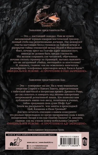 - Это - настоящий скандал. Нам не нужен насыщенный черным юмором мистический триллер, полный стеба над религиозными догмами. Нас шокируют тексты настоящих бесед учеников на Тайной вечере и раскрытие тайны отношений между Иудой и Магдалиной. Факт, почему крест на Голгофе вдруг оказался пуст, никогда не должен быть предан гласности. Мы желаем сохранить сон читателей, обреченных ночами глотать страницу за страницей, пытаясь выяснить - кто же загадочный убийца, охотящийся за апостолами? И, наконец, главное: как вы осмелились напечатать расшифровку телефонных переговоров между Раем и Адом?!