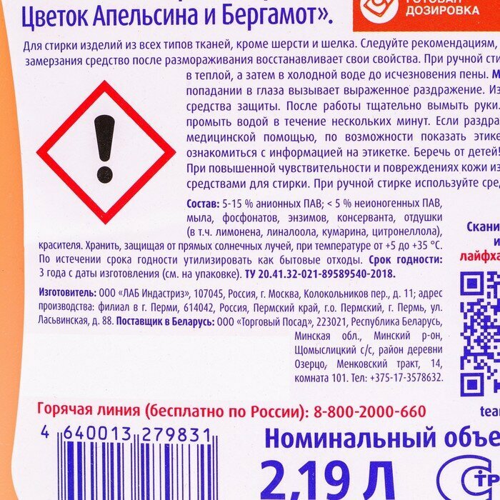 | Химический состав | 5-15% анионных ПАВ, <5% неионогенных ПАВ, мыла, фосфонатов, энзимов, консерванта, отдушки (в т.ч. бензилсалицилата), красителя. |