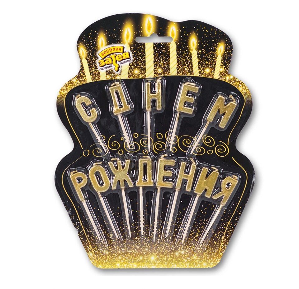 Декоративное украшение праздничного стола. Золотые Свечи в виде букв С Днем Рождения на пиках в красивой черно-золотой фигурной упаковке. Отличное решение для декорирования торта, десерта ко Дню рождения, Юбилею. Экологичный материал, оригинальный дизайн ЕУТ. Свечи не имеют запаха (отдушки). Высота свечи - 3см, высота свечи вместе с пикой - 8 см.