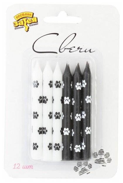 Декоративное украшение праздничного стола. Черные и белые свечи с рисунком кошачьи лапки. Коллекция Котики. Для декорирования торта, десерта ко Дню рождения. Парафин, оригинальный дизайн. Высота свечей 8см, в упаковке 12 штук без подставок.