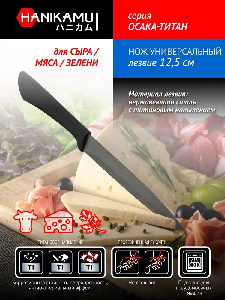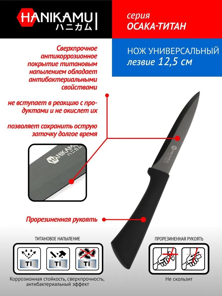 Лезвия ножей серии Осака-Титан покрыты титановым напылением, обладающим антибактериальными свойствами, не вступающим в реакцию с продуктами и не окисляя их. Сверхпрочное титановое покрытие лезвия позволяет сохранять острую заточку долгое время. Универсальный нож для выполнения операций, для которых нет отдельных инструментов. Подходит для очистки и нарезки всех видов продуктов. Узкое лезвие из нержавеющей стали с высоким содержанием углерода и хрома обладает повышенной жесткостью и антикоррозийностью. Прорезиненная рукоять.