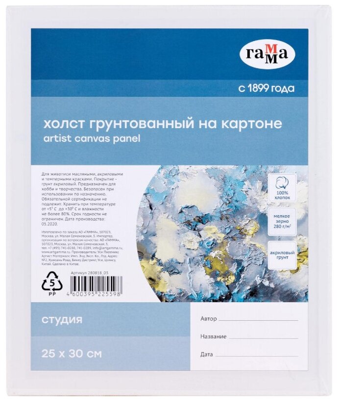 Холст на картоне Гамма Студия 25x30см 100% хлопок 280г/м2 мелкое зерно