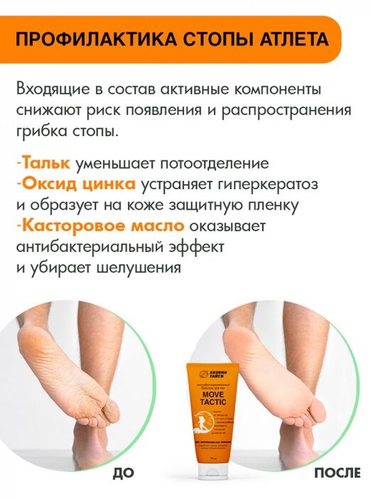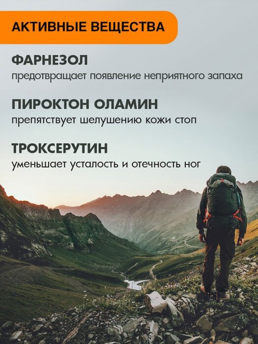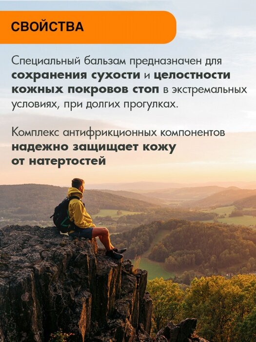 Многофункциональный бальзам для ногСпециальный бальзам предназначен для сохранения сухости и целостности кожных покровов стоп в экстремальных условиях, при долгих прогулках. Комплекс антифрикционных компонентов надежно защищает кожу от натертостей. Фарнезол- снижает активность грибковой и микробной флоры, предотвращает появление неприятного запаха.Пироктон Оламин – снижает риск возникновения грибка, препятствует шелушению кожи стоп.Троксерутин способствует: - уменьшению ощущения тяжести и усталости ног - уменьшению отечности