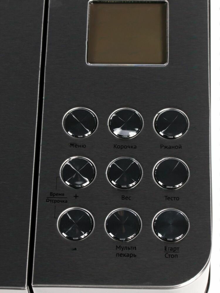| Количество программ выпечки | 25 (классический хлеб, французский хлеб, цельнозерновой хлеб, сдоба, безглютеновый хлеб, кекс, варенье и джем, бисквит, хлеб для сэндвичей, тушение, йогурт, ржаной хлеб, итальянский хлеб, мультипекарь, молочная каша, расстойка и выпечка) |