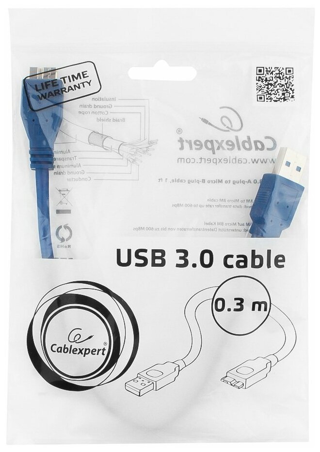 Кабель интерфейсный USB 3.0 Cablexpert CCP-mUSB3-AMBM-1 30 см экран синий пакет Gembird Pro CCP-mUSB3-AMBM-1
