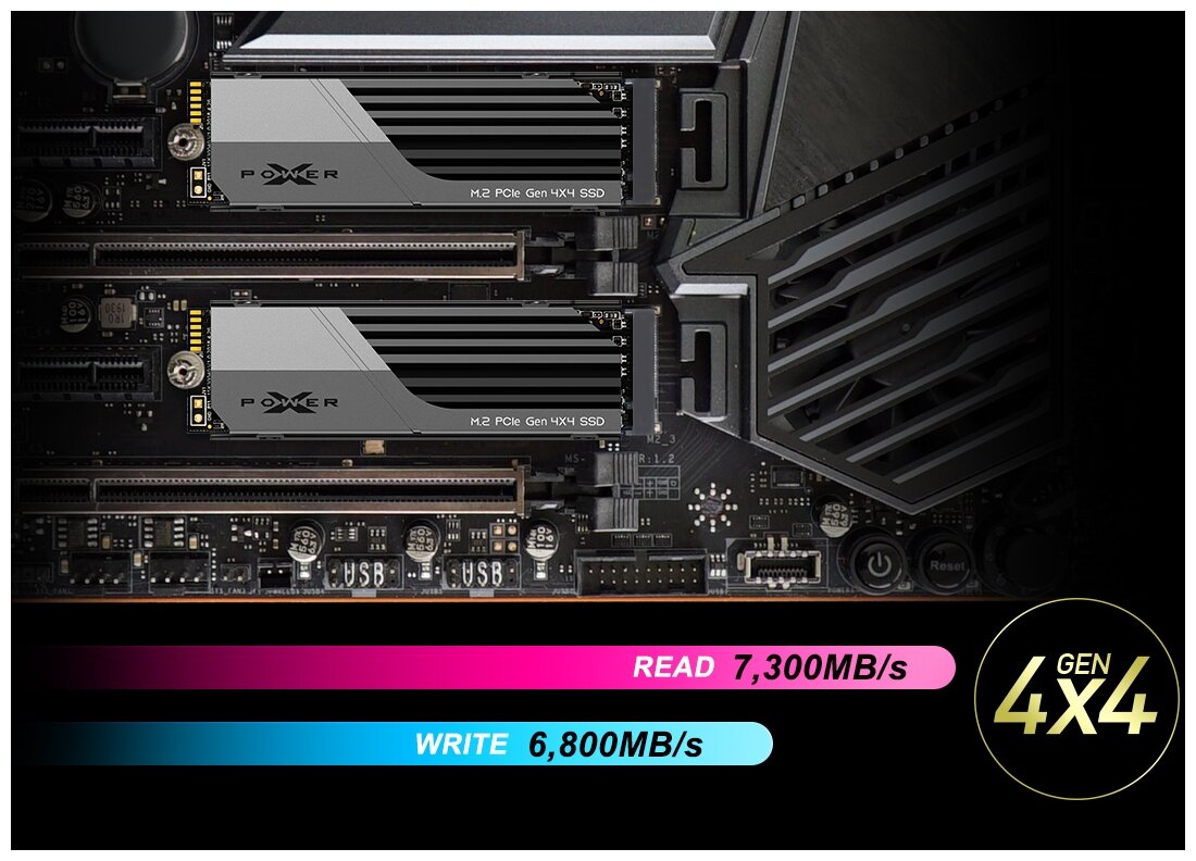 Накопитель SSD Silicon Power XS70 SP02KGBP44XS7005, объем накопителя 2TB, форм-фактор: M.2 2280, интерфейс: PCI-E 4.0 x4, тип NAND: 3D, скорость чтения до 7300МБ/с, скорость записи до 6800МБ/с
