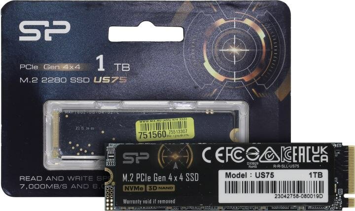Накопитель SSD Silicon Power US75 SP01KGBP44US7505, объем накопителя 1TB, форм-фактор: M.2 2280, интерфейс: PCI-E 4.0 x4, тип NAND: 3D, скорость чтения до 7000МБ/с, скорость записи до 6000МБ/с