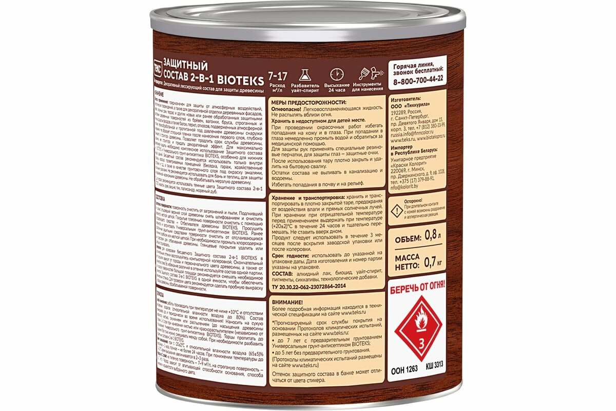 Антисептик ТЕКС БИОТЕКС, состав 2 в 1 КЛАССИК, декоративное лессирующее средство для защиты древесины от атмосферных воздействий, биологических повреждений, а также для декоративной отделки стен, дверей, оконных рам, террас (в т.ч. полов) и других новых или ранее обработанных защитными средствами деревянных строительных конструкций снаружи помещений. Не образует сплошной пленки после нанесения первого слоя, глубоко проникает в структуру древесины. Позволяет продлить срок службы древесины, сохранить ее структуру и придать декоративный эффект.Расход: 10-14м2/л по строганой и бревенчатой поверхности древесины, 4-6м2/л по пилёной поверхности древесины. Время высыхания на отлип – 1 час, следующий слой можно наносить через – 12 часов, полное – не более 24 часов.Выберите Состав 2-в-1 BIOTEKS Классик орегон (0,8л) по доступным ценам. Оформите заказ, и мы доставим его, как можно скорее.