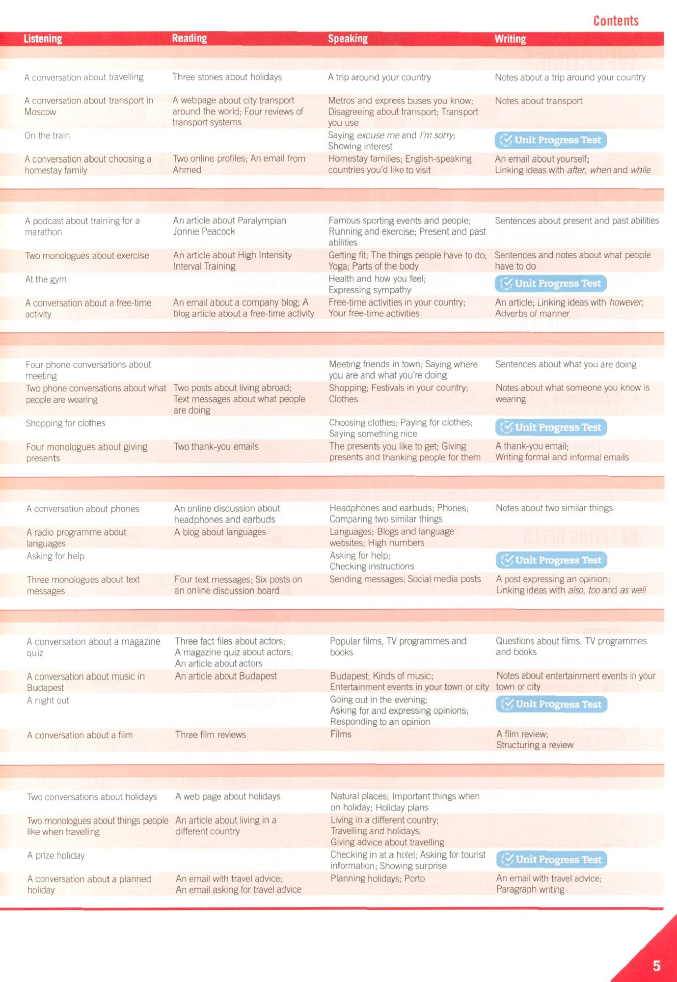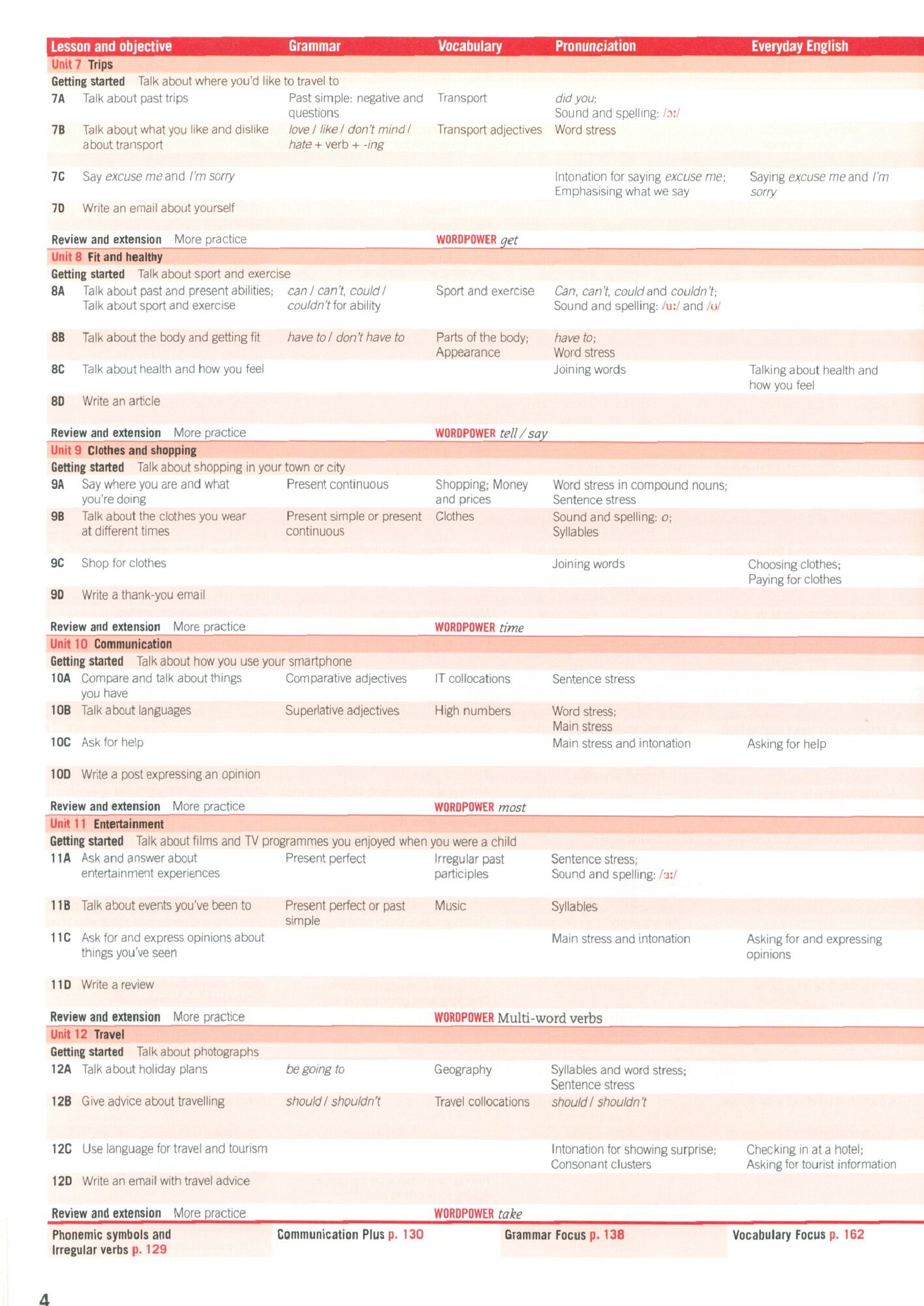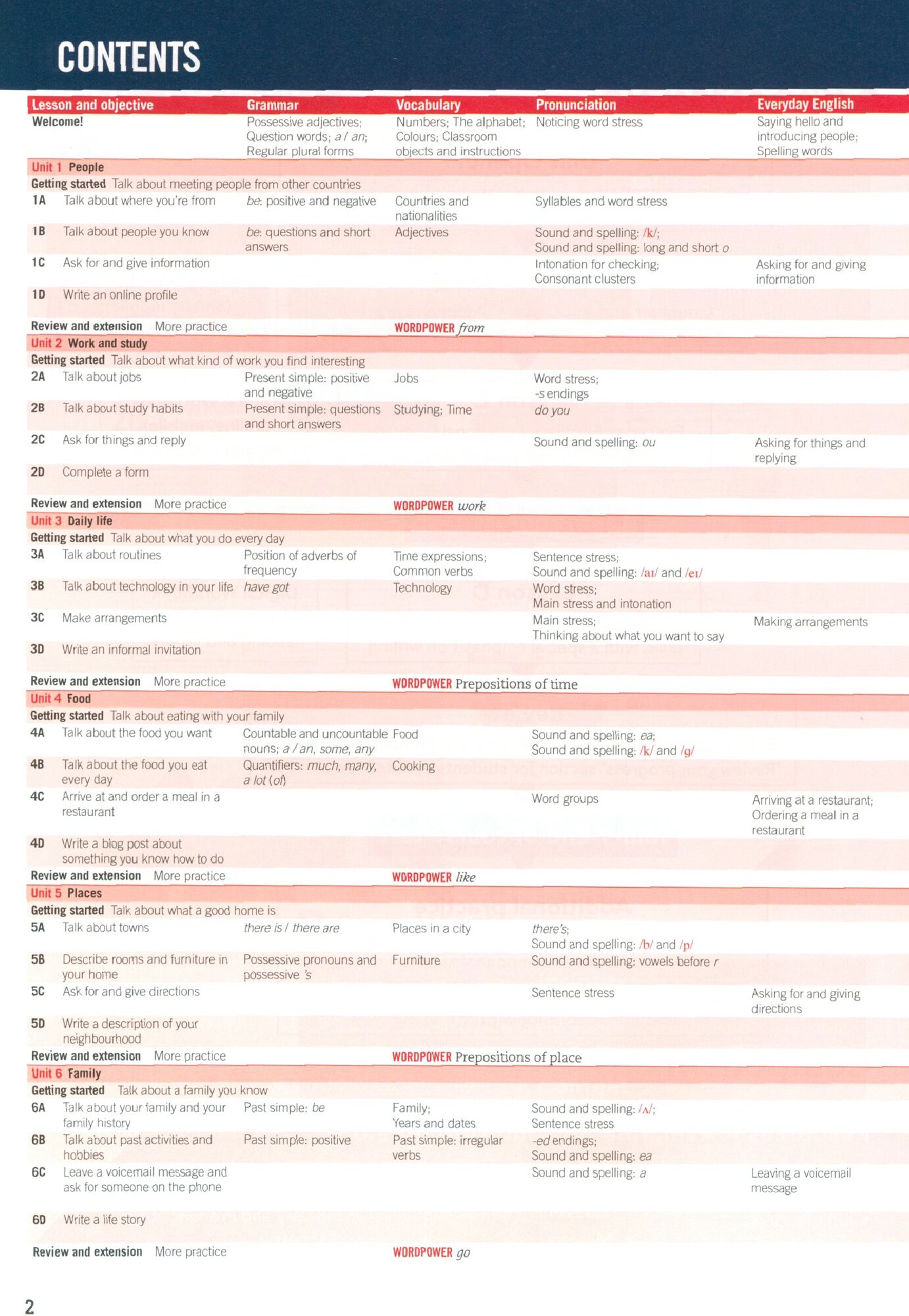 Учебник ставит перед учащимися четкие цели обучения. Он обеспечивает базовую грамматику и словарный запас наряду с набором навыков. Уроки разговорной речи предлагают уникальное сочетание функционального языка, произношения и разговорных навыков, а также видео, помогающее учащимся эффективно общаться в реальном мире. Каждый модуль заканчивается закреплением изученного в нем.
