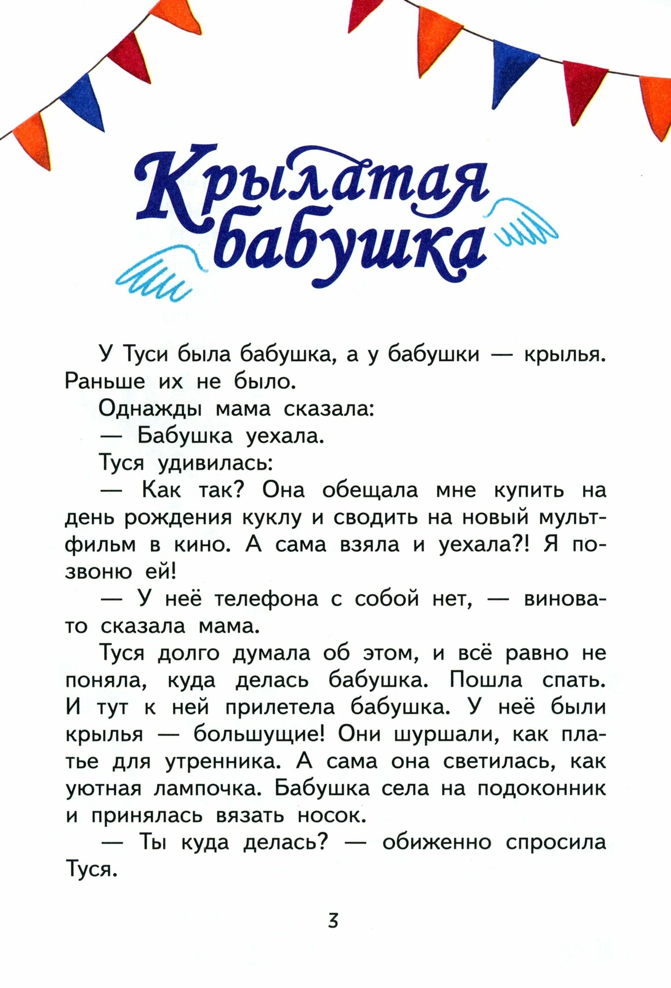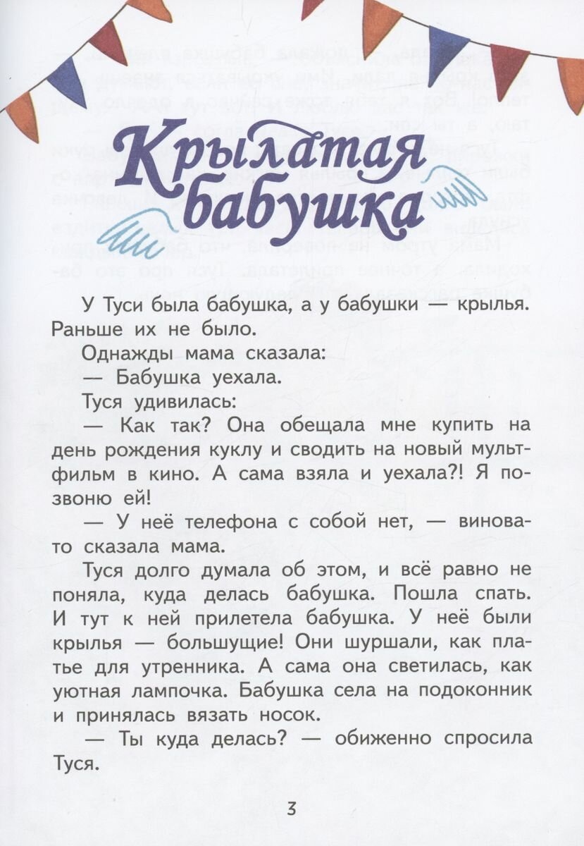 Первая сказка рассказывает о девочке Туси и её семье: папе, маме, дедушке и бабушке. Правда с бабушкой что-то произошло: ей пришлось очень быстро куда-то уехать. Так ей сказала мама. Туся очень огорчилась, ведь бабушка обещала купить ей куклу и сходить с ней в кино. Расстроившись, девочка пошла спать. И вдруг к ней прилетела бабушка. Да-да, прилетела, потому что у неё были большущие крылья, а сама она светилась. Бабушка сидела на подоконнике, вязала носки и беседовала с внучкой… Мама утром, выслушав Тусю, не поверила, что бабушка прилетала. Тогда в следующий раз Туся с бабушкой договорились о том, что внучка будет передавать маме, папе и дедушке всё, что говорит бабушка. И это был их секрет. С тех пор Туся стала разговаривать от лица бабушки, но не словами, а действиями. Она целовала дедушку в колючую щеку, приносила ему любимую подушку, добавляла папе в чай лимон и рисовала маме открытки. Это было так привычно, как и то, что раньше делала бабушка и позволяло всем почувствовать присутствие бабушки. Эта сказочная история мотивирует нас помечтать о том, чтобы все бабушки, которые однажды уехали далеко, обязательно возвращались хотя бы в наших снах.