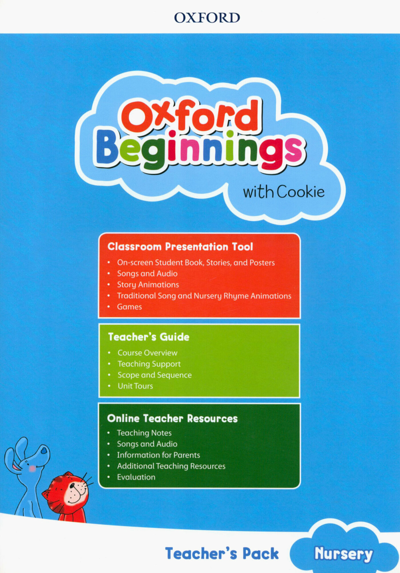 Oxford Beginnings with Cookie is a gentle, song-based introduction to English for learners aged 2-3. It is a flexible package, tailored to suit the varying needs of students at Nursery level, and designed to be used as a precursor to any one of Oxford University Press' Kindergarten courses.