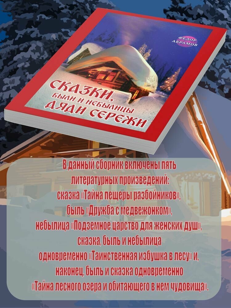 В данный сборник включены пять литературных произведений: сказка «Тайна пещеры разбойников», быль «Дружба с медвежонком», небылица «Подземное царство для женских душ», сказка, быль и небылица одновременно «Таинственная избушка в лесу» и, наконец, быль и сказка одновременно «Тайна лесного озера и обитающего в нем чудовища». Книга предназначена, прежде всего, для подростков школьного возраста, интересующихся сказками и произведениями приключенческого характера. Но она может быть интересна и взрослым читателям, интересующимся приключенческой литературой. Но читателям, имеющим слишком нервный, впечатлительный характер, от чтения первой сказки лучше воздержаться! Она написана не для слабонервных читателей. Приятного чтения любителям литературы приключенческого характера.