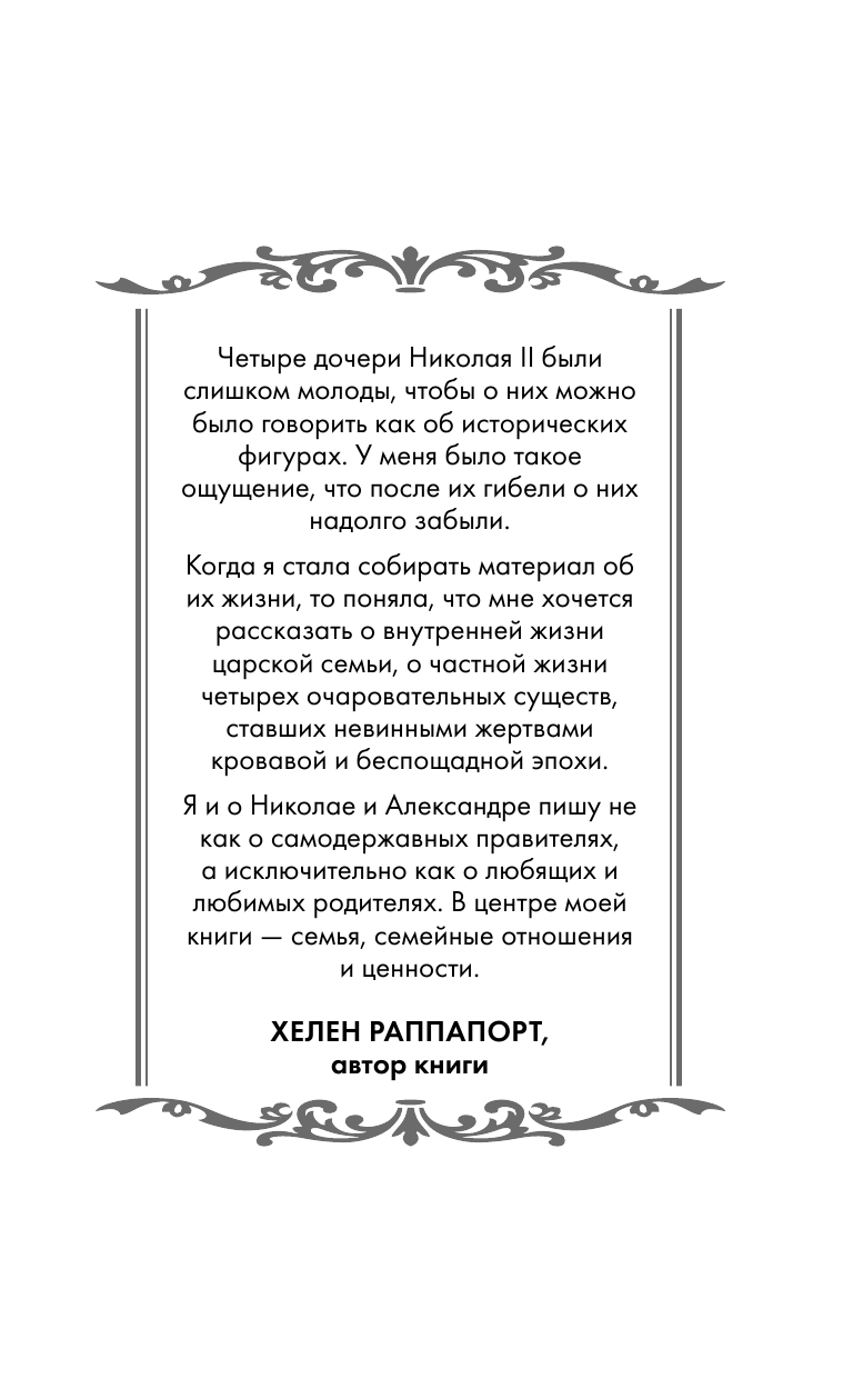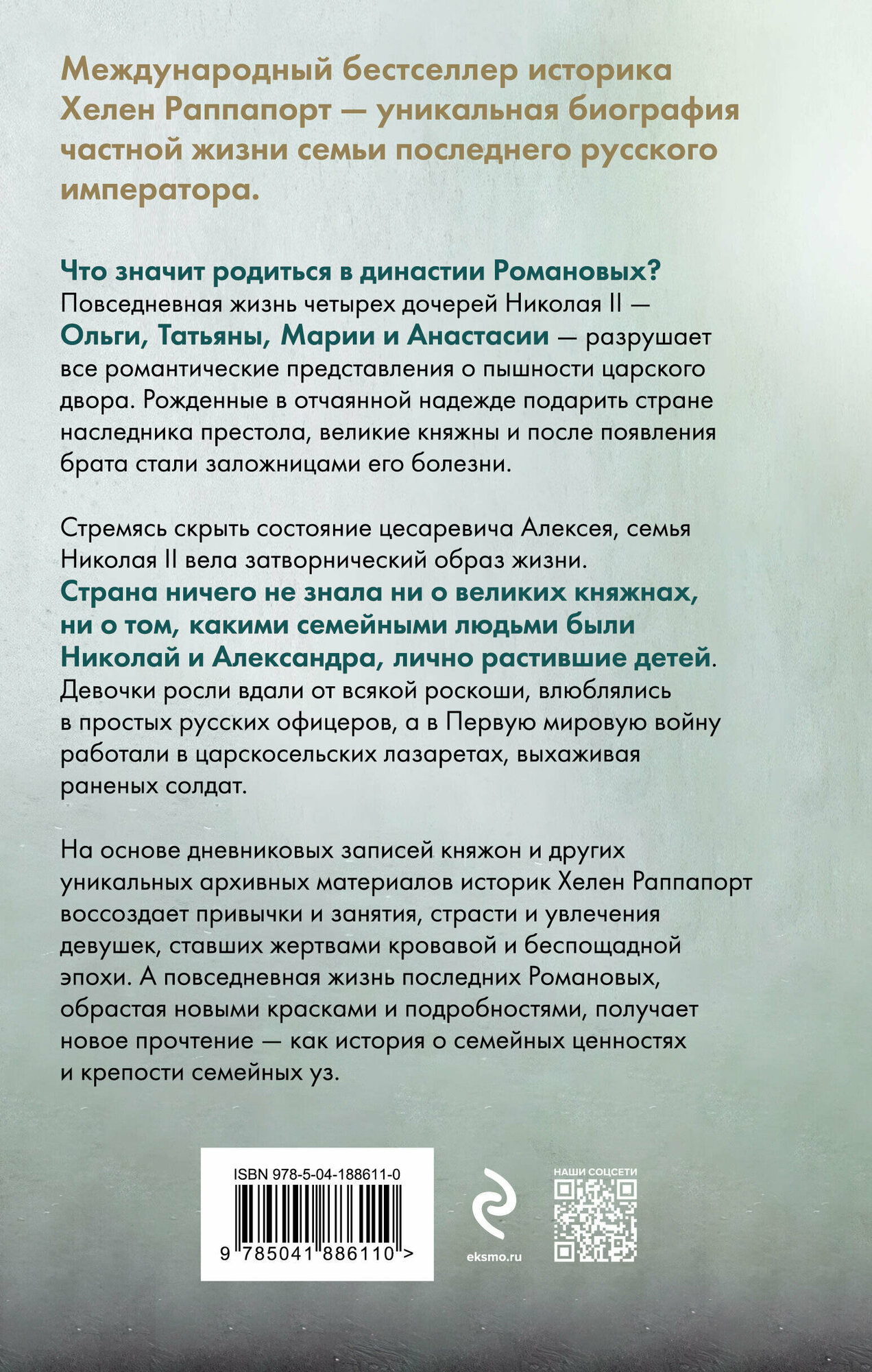 Какими были четыре дочери последнего русского царя? Чем интересовались, как проводили время и в кого влюблялись? Какая атмосфера царила внутри семьи Романовых? На основе дневниковых записей княжон и других уникальных архивных материалов историк Хелен Раппапорт воссоздает привычки и занятия, страсти и увлечения девушек. А повседневная жизнь последних Романовых, обрастая новыми красками и подробностями, получает новое прочтение - как история о семейных ценностях и крепости семейных уз.