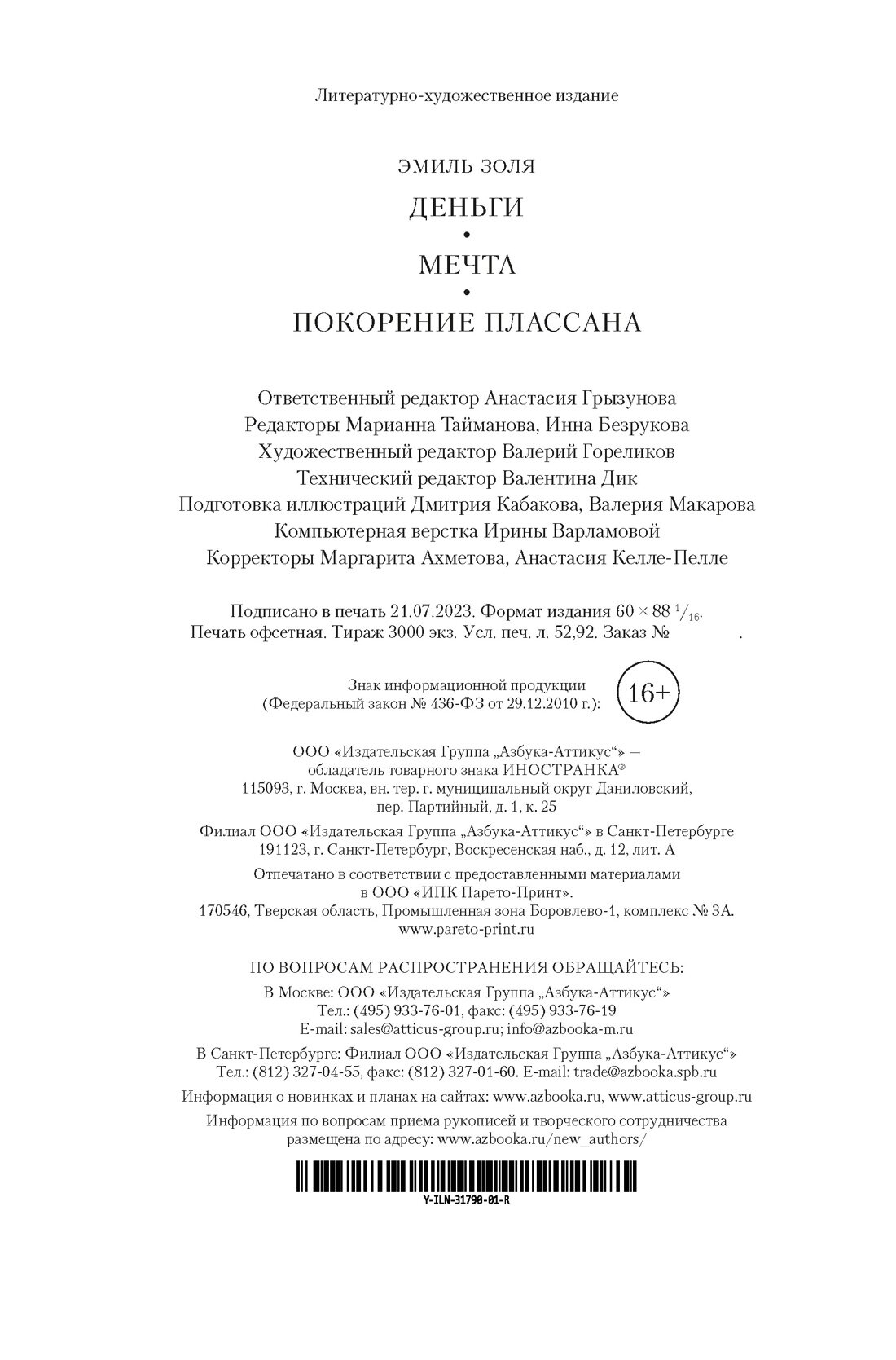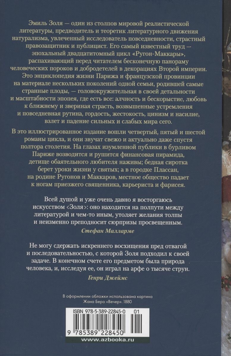 Эмиль Золя — один из столпов мировой реалистической литературы, предводитель и теоретик литературного движения натурализма, увлеченный исследователь повседневности, страстный правозащитник и публицист, повлиявший на все реалистическое направление литературы XX века и прежде всего — на школу «новой журналистики»: Трумена Капоте, Тома Вулфа, Нормана Мейлера. Его самый известный труд — эпохальный двадцатитомный цикл «Ругон-Маккары», распахивающий перед читателем бесконечную панораму человеческих пороков и добродетелей в декорациях Второй империи. Это энциклопедия жизни Парижа и французской провинции на материале нескольких поколений одной семьи, родившей самые странные плоды, — головокружительная в своей детальности и масштабности эпопея, где есть все: алчность и бескорыстие, любовь к ближнему и звериная страсть, возвышенные устремления и повседневная рутина, гордость, жестокость, цинизм и насилие, взлет и падение сильных и слабых мира сего. В это иллюстрированное издание вошли четвертый, пятый и шестой романы цикла, и они звучат свежо и актуально даже спустя полтора столетия. На глазах изумленной публики в бурливом Париже возводится и рушится финансовая пирамида, детище обаятельного любителя наживы; бедная сиротка берет уроки жизни у святых; а в захолустном городке Плассан, на родине Ругонов и Маккаров, местное общество падает к ногам приезжего священника, карьериста и фарисея. Романы «Мечта» и «Покорение Плассана» издаются в новых переводах. Некоторые иллюстрации Натана Альтмана к роману «Деньги» публикуются впервые.