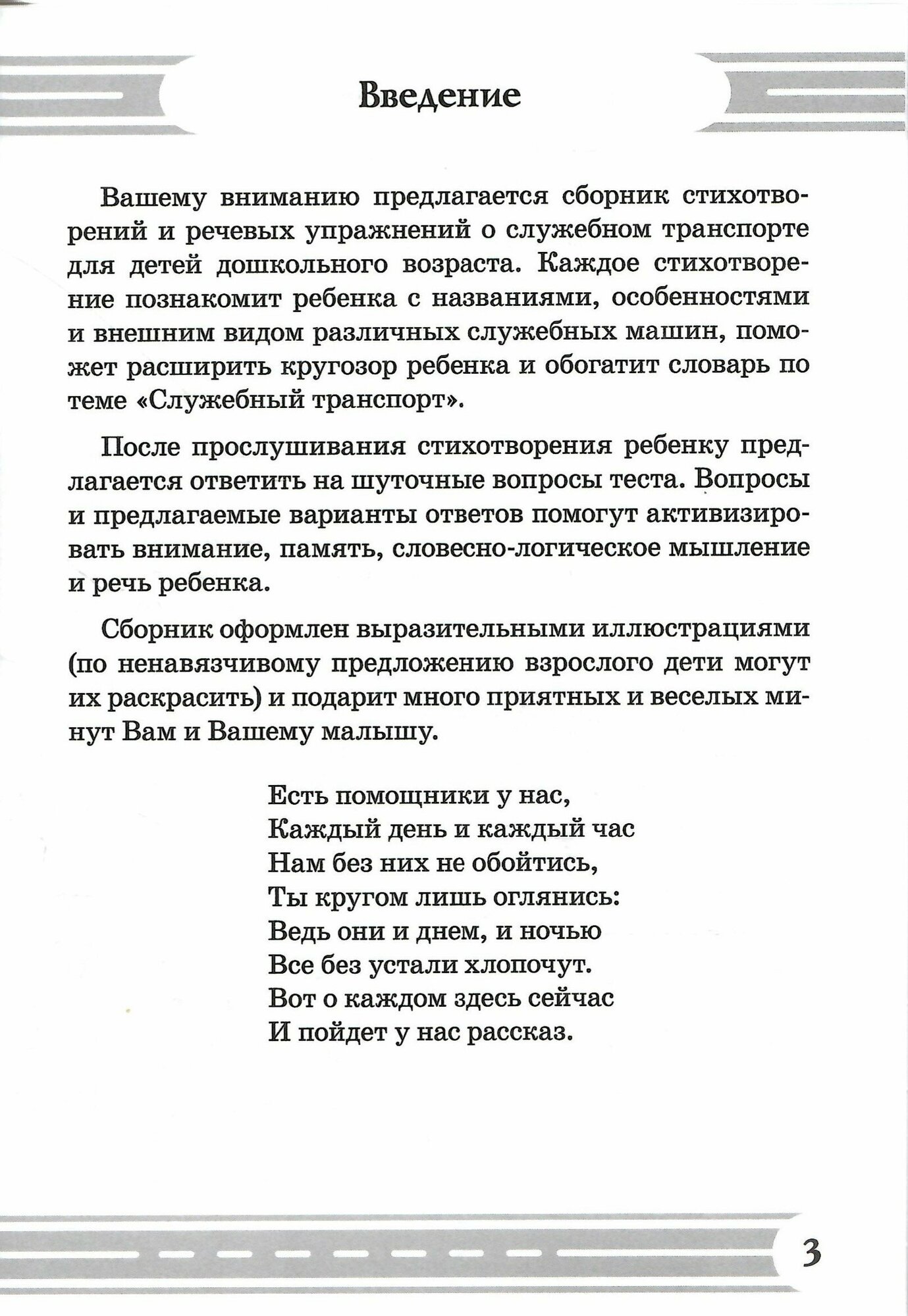 В данный сборник вошли стихотворения, которые познакомят ребенка с названиями и внешним видом различных служебных машин. После каждого стихотворения предлагаются маленький шуточный тест, вопросы и варианты ответов, которые помогут активизировать внимание, память, словесно-логическое мышление и речь ребенка.