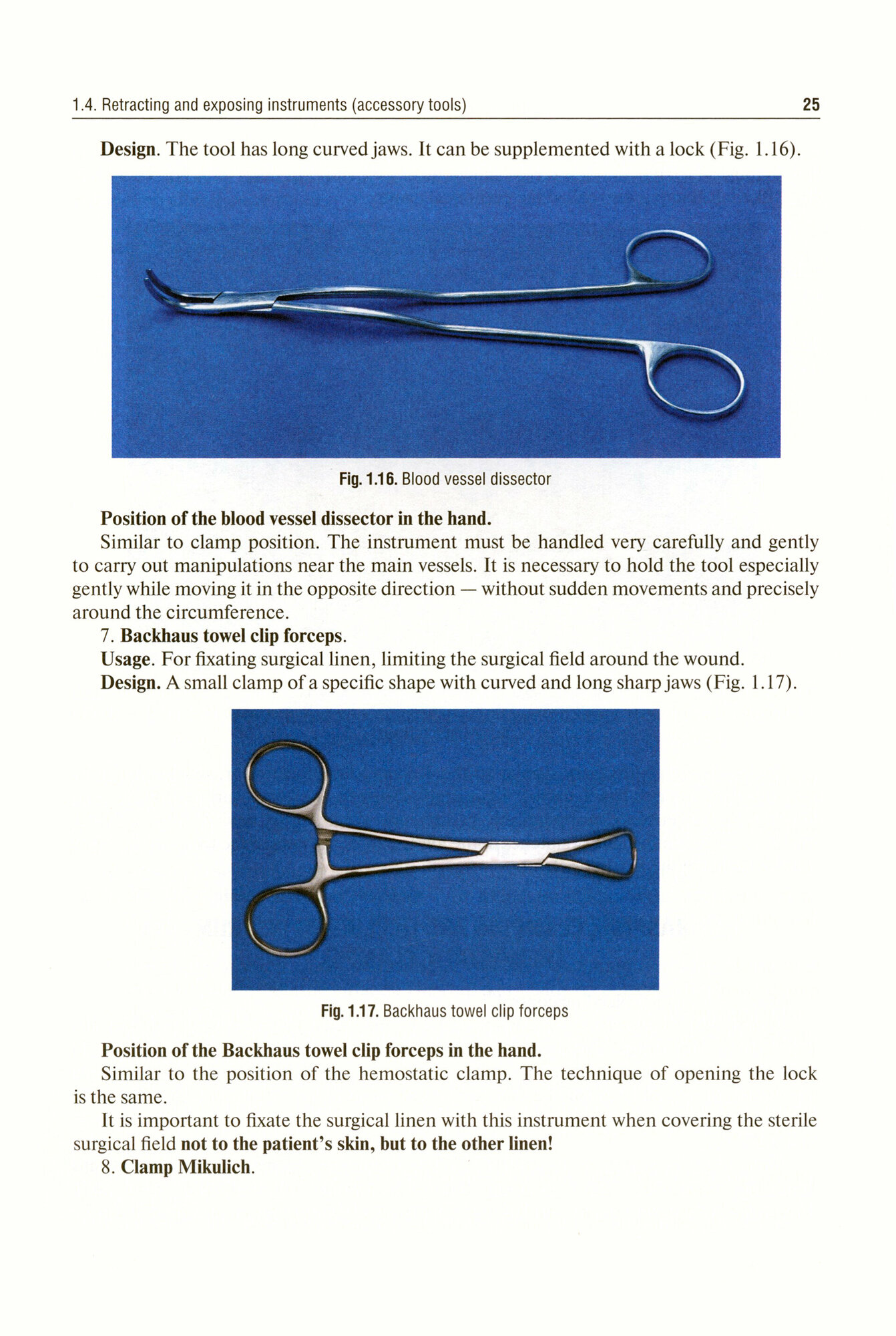 At the Department of Operative Surgery and Topographic Anatomy, the student must also acquire the ability to use general surgical instruments (instruments for tissue separation, accessory and fi xing instruments, hemostatic clamps, instruments for tissue connection). The final establishment of surgical skills should be provided for by training in clinical surgical departments and during industrial practice.
