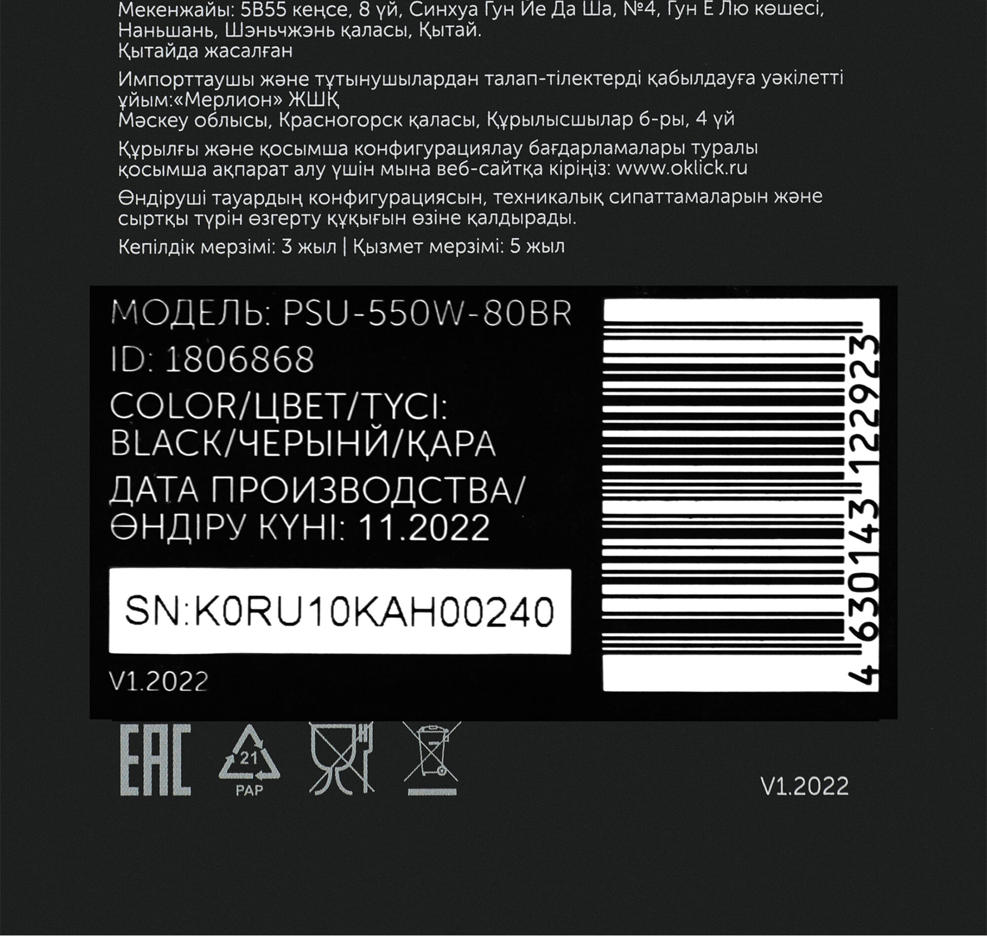 | Артикул производителя (Part Number) | PSU-550W-80BR |