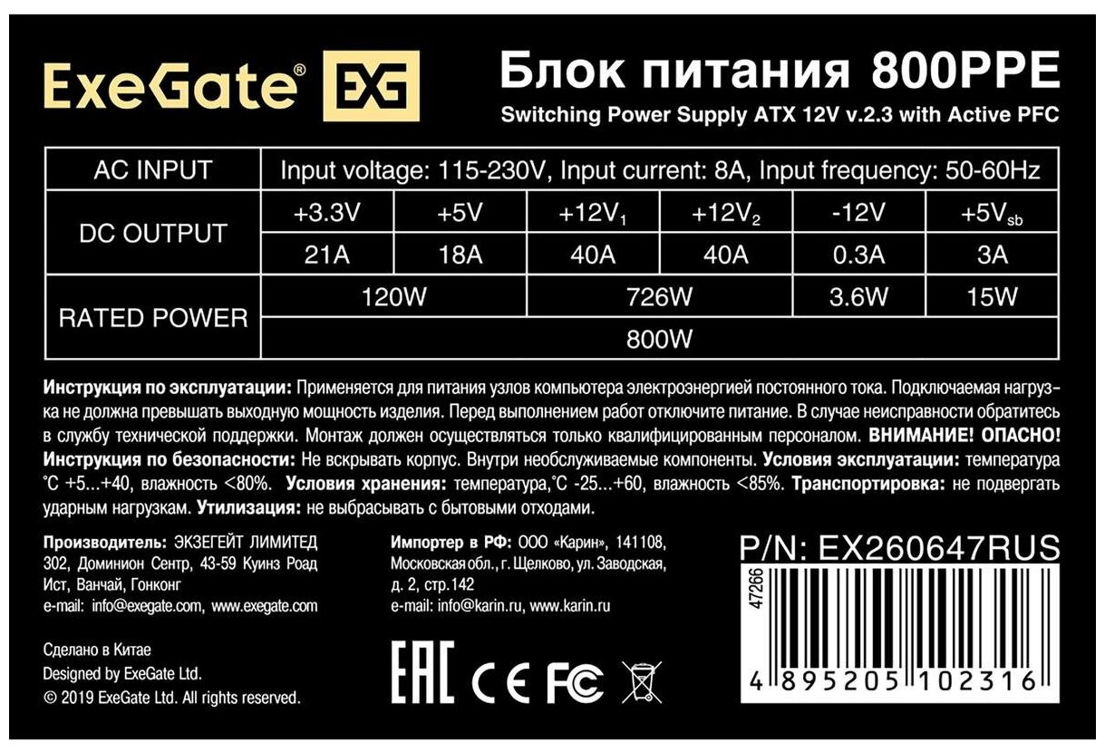 Блок питания ExeGate 800PPE EX260647RUS-PC 800W