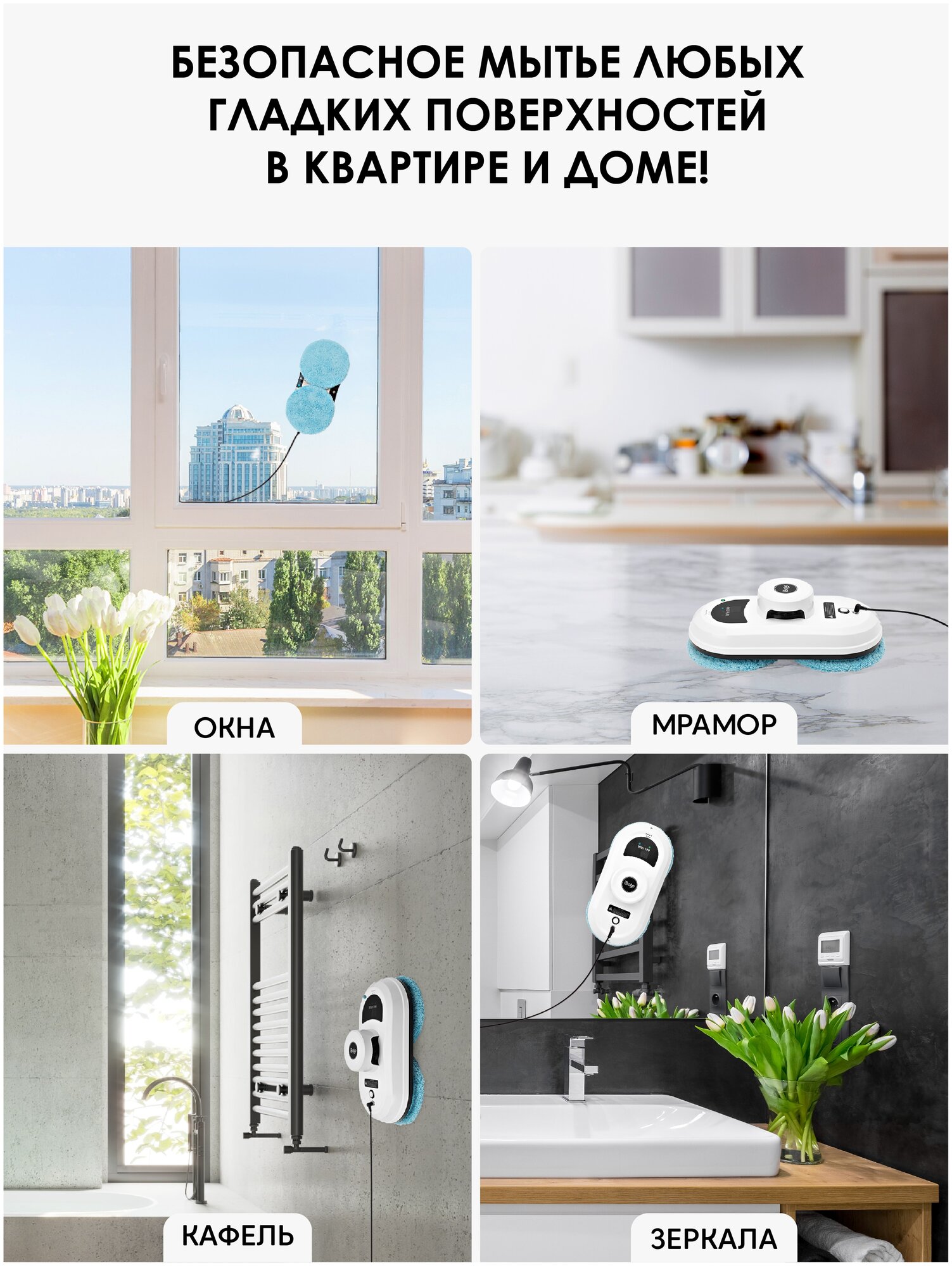Мойщик окон-робот iBoto в белом корпусе будет незаменим там, где необходимо привести в порядок поверхности, будь то окна, зеркала, витрины или же напольные покрытия. Модель легко справляется как с сухой, так и влажной уборкой, оставляя за собой кристально чистые поверхности, освобождая при этом вас от ненавистной уборки. Устройство справится работой на любых поверхностях: вы можете использовать его не только на горизонтальных покрытиях, в вертикальном положении прибор справляется с задачей ничуть ни хуже. 35x35 см – именно такой минимальный размер поверхности поддерживает мойщик для очистки.