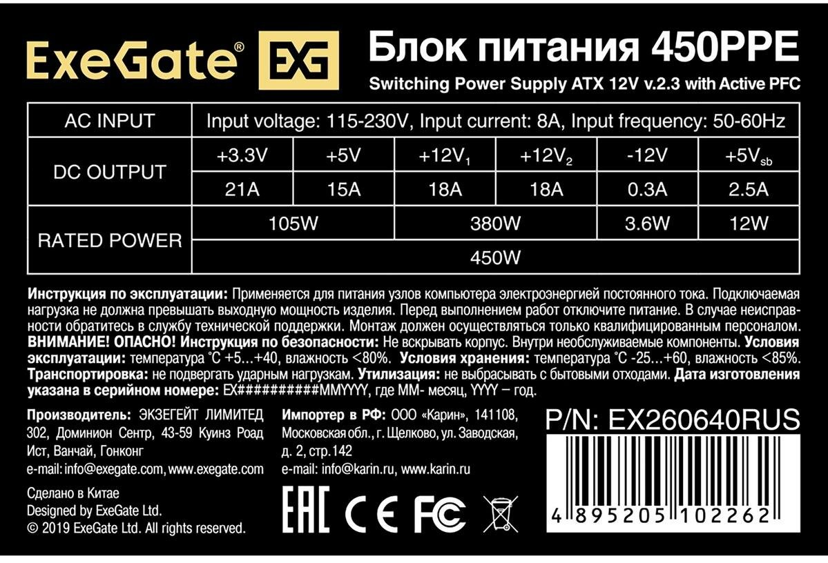 ExeGate это качественный источник питания для персонального компьютера, способный снабдить компоненты постоянным током и необходимым каждому элементу напряжением. Мощности рассматриваемой модели будет достаточно для стабильной работы системы среднего уровня. За эффективное охлаждение устройства, даже на пиковых нагрузках, отвечает вентилятор диаметром 12 см. Блок питания имеет разъем 24-pin для материнской платы, 2× 4+4-pin для процессора, 2× 6+2 pin PCI-E для дискретной графики, 5 SATA для питания накопителей и оптического привода, Molex для подключения старых жестких дисков и некоторых других устройств. Благодаря защите от коротких замыканий, перегрузки, перегрева, повышенного и пониженного напряжение БП способен обеспечить сохранность системы и ее безотказную работу.