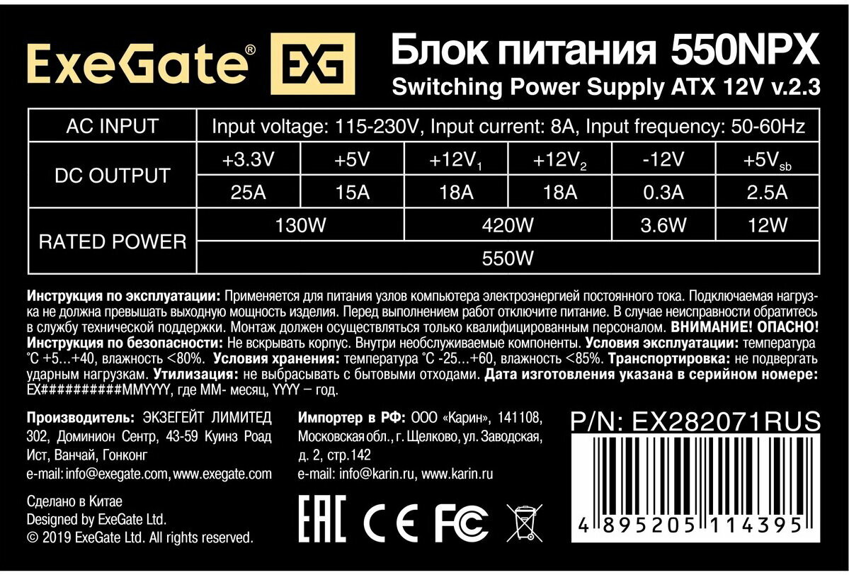 Блок питания 550W ExeGate 550NPX (ATX, SC, 12cm fan, 24pin, 4pin, PCIe, 3xSATA, 2xIDE, FDD, black, кабель 220V с защитой от выдергивания)
