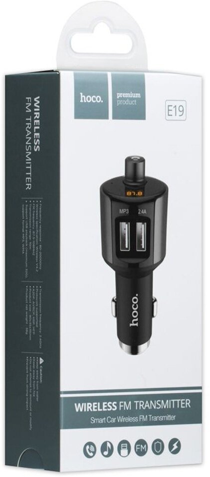 Hoco E19 – инновационное и многофункциональное устройство, работающее от прикуривателя в автомобиле. Аксессуар проигрывает музыку с USB-флешки или смартфона через Bluetooth, заряжает два устройства одновременно и позволяет отвечать на входящие звонки по громкой связи, освободив при этом руки для управления автомобилем. E19 станет незаменимым помощником для людей, которые большую часть дня проводят за рулем автомобиля, и при этом вынуждены отвечать на множество звонков, поступающих на смартфон. Преимущества автомобильного зарядного устройства с FM-трансмиттером 2xUSB Hoco E19 - Metal GrayЗарядка работает от напряжения в 12-24 В. Подойдет для большинства моделей автомобилей. В два USB разъема подключаются зарядные кабели гаджетов или флешка. Заряжать можно два мобильных устройства одновременно. Над портом предназначенным для флешки написано MP3. Чтобы прослушать записанную на нее музыку, понадобится только установить одинаковую частоту на FM-модуляторе и автомагнитоле. Аксессуар позволяет прослушивать музыкальные треки, сохраненные в телефоне. Для этого его надо будет подключить через Bluetooth к FM-трансмиттеру. Благодаря встроенному микрофону – это еще и устройство громкой связи. Синхронизируйте смартфон с Hoco E19 и отвечайте на звонки, не отвлекаясь от управления машиной. Для управления аксессуаром сверху на корпусе предусмотрена кнопка. Нажав на нее, можно: поменять режим работы, начать воспроизведение трека, поставить его на паузу, ответить на звонок и закончить разговор. Чтобы переключить песни или настроить рабочую частоту, надо покрутить кнопку. Сверху над портами расположен небольшой дисплей. На нем отображается установленная частота передачи радиосигнала. Технические характеристики автомобильного зарядного устройства с FM-трансмиттером 2xUSB Hoco E19 - Metal GrayВходное напряжение: 12-24 ВОбщий выходной ток: 2.4 АВерсия Bluetooth: 4.2Частота передачи: 87.5 - 108 МГцПоддерживаемые форматы: MP3/ WMAПоддерживаемые носители: USB-флешка (max 32G)Размеры: 90х35х35 ммВес: 38 г