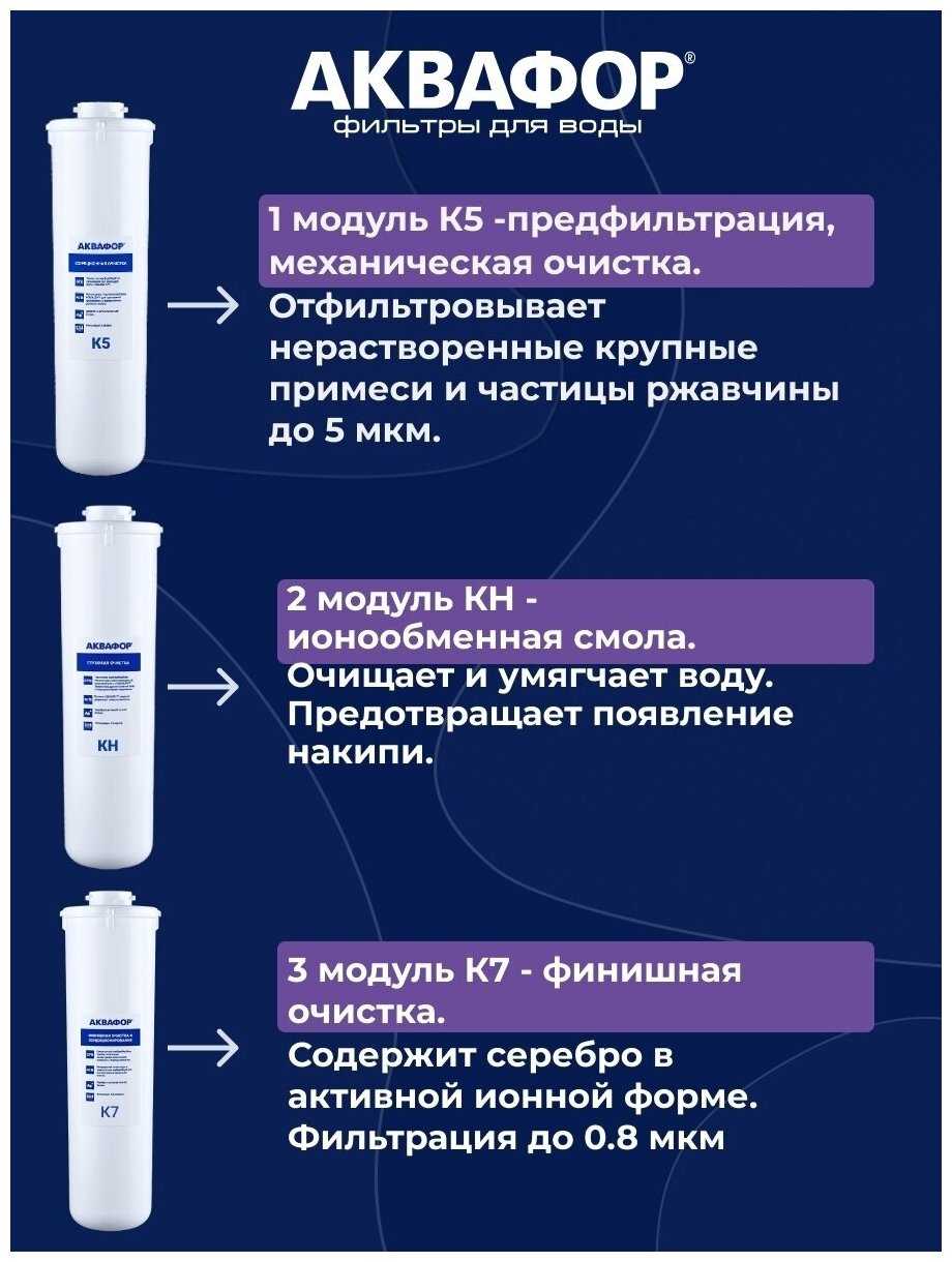 Комплект модулей для для Аквафор Кристалл наКомплект сменных модулей глубокой очистки и умягчения воды низкой и средней жесткости. Эффективно снижает появление белого налета, модуль с ионообменной смолой подлежит регенерации. В зависимости от жесткости исходной воды, регенерацию потребуется проводить в срок до 3х месяцев. В условиях жесткой воды он полностью выполняет функцию глубокой очистки от вредных примесей.Легкая и безопасная замена модуля по клику:Замена модулей займет 1 минуту и не потребует инструментов, контакт с содержимым использованного модуля полностью исключен.Увеличенный ресурс: по сравнению с серией фильтров семейства Трио, модули семейства Кристалл имеют больший размер и вмещают на 10 больше сорбента, а значит обеспечат больше литров чистой воды.В комплекте три картриджа: K5, KН и K7.