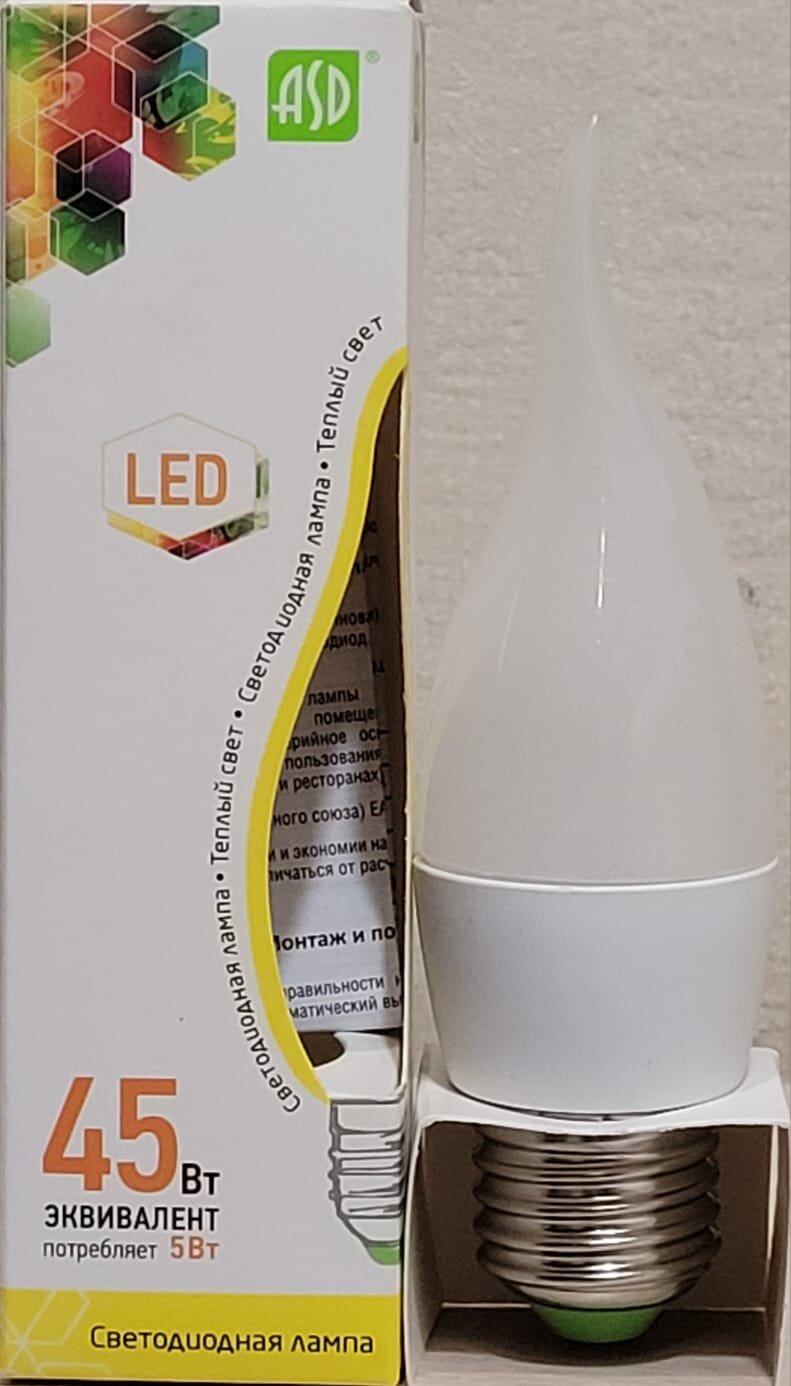 - Светодиодная лампа ASD Е27 5W 3000K С37 свеча
