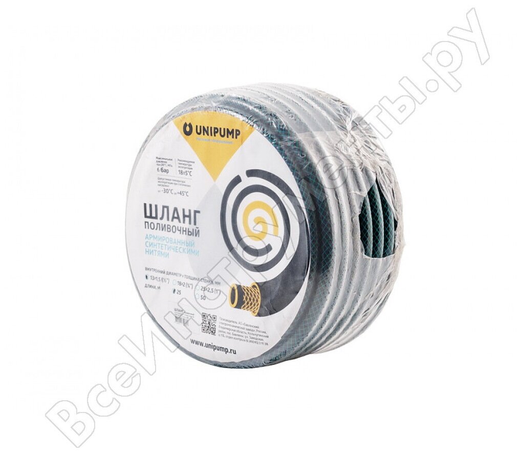 | Прочие особенности и свойства | Шланг поливочный UNIPUMP — армированный синтетическими нитями, изготавливается экструзионным методом из полимерных материалов. Применяется в качестве гибких трубопроводов для подачи питьевой и технической воды. Может использоваться для бытовых нужд, в машиностроении, в пищевой, перерабатывающей и других отраслях промышленности. |