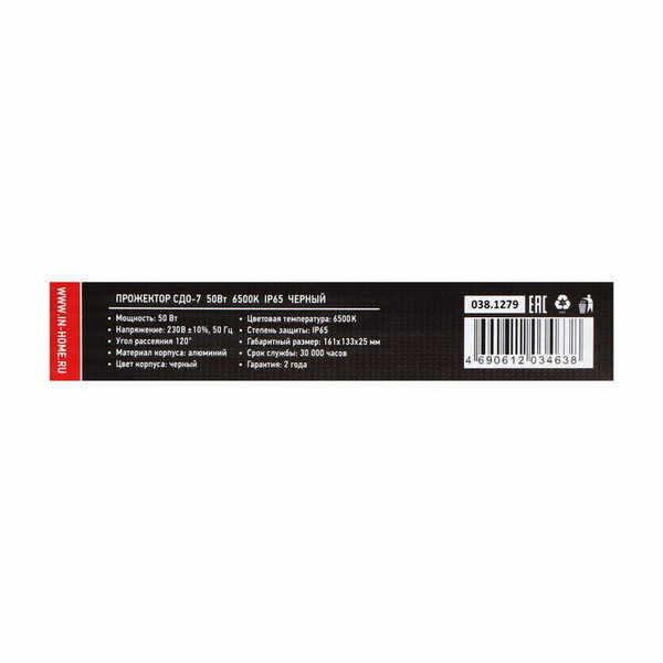 Прожектор светодиодный IN HOME СДО-7 50Вт 6500К IP65 4500лм 230В черный 4690612034638
