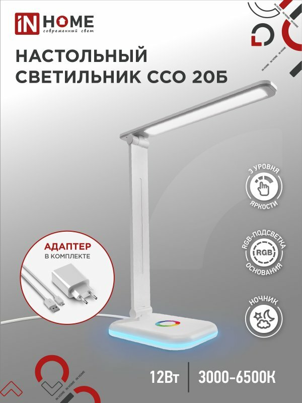Светильник настольный светодиодный IN HOME ССО 20 Б 12 Вт 6500 К 640 Лм RGB - подсветка, сенсор - диммер, с адаптером. Светильник белого цвета, мощность 12 Ватт. Сенсорное управление. Регулировка наклона и поворота плафона. Режим ночника. Складная конструкция. Питание от сети. Гарантия - 2 года. Преимущества: - Экономичность. - Экологическая безопасность. - Комфорт для зрения. Способ применения:- Включите адаптер в розетку. - Поверните плафон на нужный угол. - Настройте уровень яркости света (три режима). - Управляйте RGB подсветкой. Светильник ССО 20 подходит для дополнительного освещения рабочего стола дома и в офисе. Отличное решение для школьников и студентов. Работает от розетки 220 В.