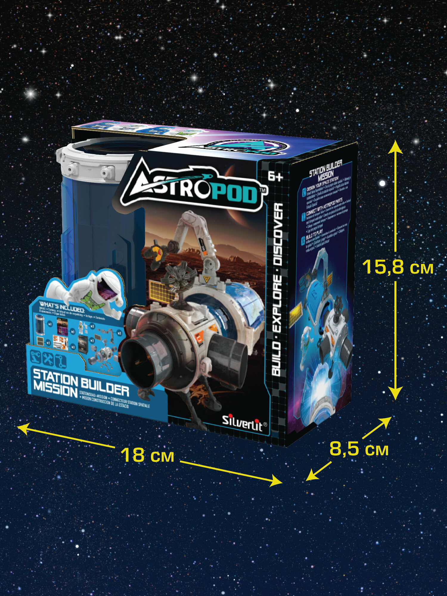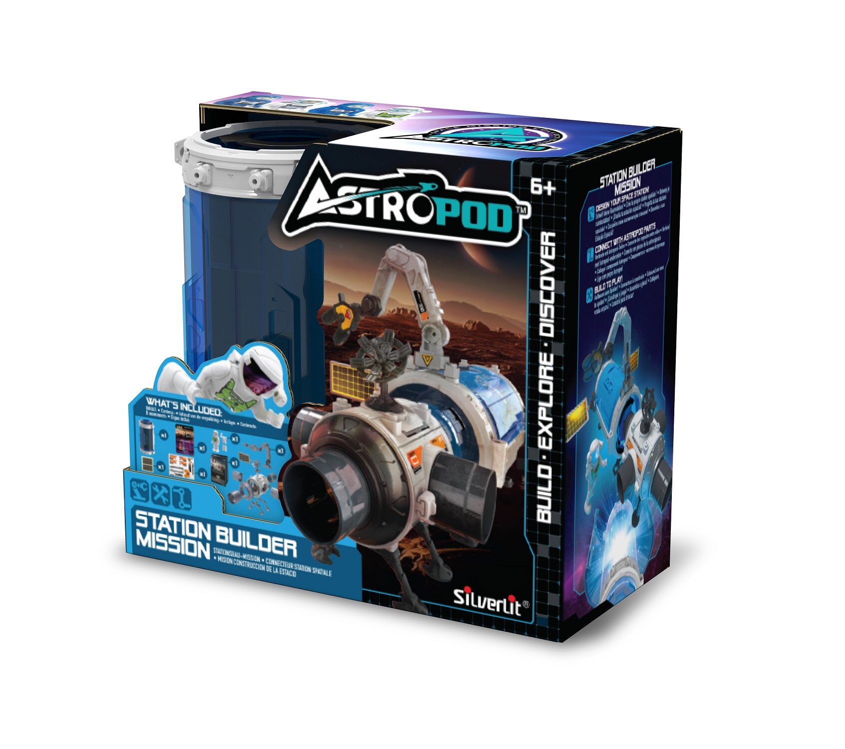 "Игрушка Миссия Стройка станции от Сильверлит позволит ребёнку и взрослому построить игрушечную космическую станцию, которая будет очень похода на настоящую.В наборе: 31 деталь для сборки базовой космической станции; астронавт с подвижными руками и ногами, чтобы его можно было посадить; открывающееся капсула.Но это ещё не всё! Станция совместима с другими капсулами из серии Астропод. Приобретая любую другую миссию Вы сможете увеличить станцию. Т.к. капсулы крепятся не только к базовому шлюзу, но и между собой, вы можете построить свою уникальную станцию, дизайн которой ограничивается только вашей фантазией.Для того чтобы игрушка была более интересной, она оснащена подвижной «рукой захватом», антенной и другими мелкими деталями.Размер собранного базового шлюза без присоеденённых капсул: 6 (ширина) х 6 (высота) см.Капсула совместима с другими капсулами серии Astropod и дополняет любые Миссии Astropod. Таким образом приобретая 2 любые миссии от Астропод, Ваш малыш сможет построить целую космическую базу.Собери все космические игрушки Astropod."