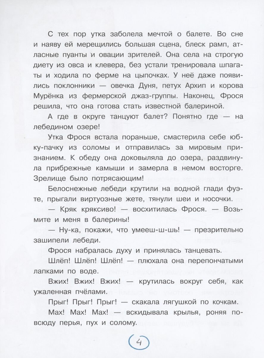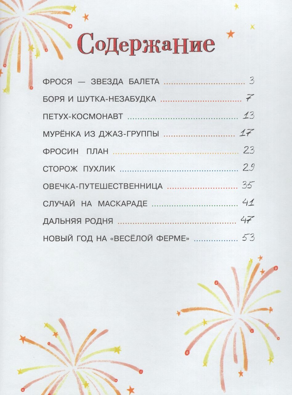 Кто живёт на "Весёлой ферме"? Уточка Фрося, мечтающая танцевать балет вместе с прекрасными лебедями. Козёл Борис - весельчак и остряк, с которым однажды случилась забавная история. Корова Мурёнка из джаз-группы, которая по вечерам собирает концерты и мечтает выступить в Му-у-уриинском театре. Петух Архип - первый петух-космонавт, который полетел в космос в дырявом сапоге навстречу звезде по имени Солнце. Пёс Пухлик, добродушный сторож и хороший друг. Овечка Дуня, мечтающая отправиться в кругосветное путешествие. Тихая и скромная свинка Паша, которая с нетерпением ждёт в гости свою дальнюю "родственницу" - морскую свинку Машу. Кошечка Лапушка породы сфинкс, которая однажды напугала всех жителей фермы. С героями часто случается что-нибудь смешное. Об их приключениях вы сможете узнать из нашего сборника рассказов.