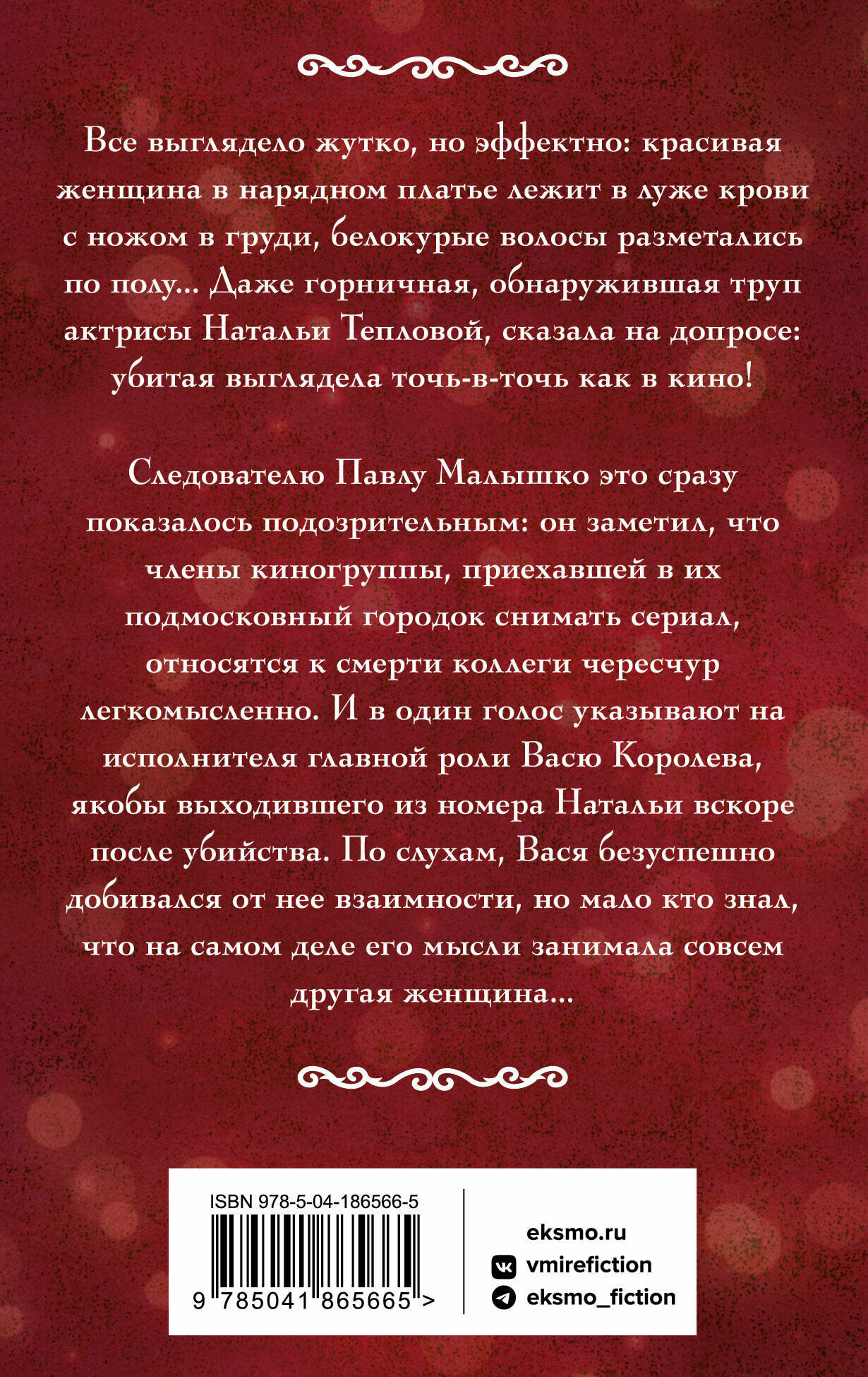 Все выглядело жутко, но эффектно: красивая женщина в нарядном платье лежит в луже крови с ножом в груди, белокурые волосы разметались по полу… Даже горничная, обнаружившая труп актрисы Натальи Тепловой, сказала на допросе: убитая выглядела точь-в-точь как в кино! Следователю Павлу Малышко это сразу показалось подозрительным: он заметил, что члены киногруппы, приехавшей в их подмосковный городок снимать сериал, относятся к смерти коллеги чересчур легкомысленно. И в один голос указывают на исполнителя главной роли Васю Королева, якобы выходившего из номера Натальи вскоре после убийства. По слухам, Вася безуспешно добивался от нее взаимности, но мало кто знал — на самом деле его мысли занимала совсем другая женщина…