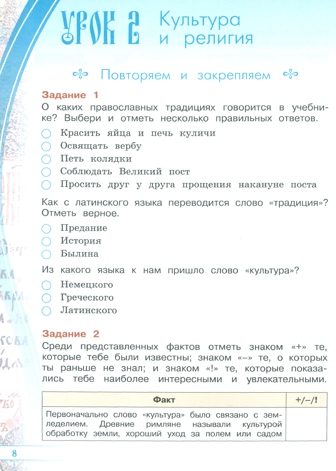 Рабочая тетрадь разработана в соответствии с Федеральным государственным образовательным стандартом начального общего образования и Примерной рабочей программой "Основы религиозных культур и светской этики". Содержание тетради отражает особенности тематического планирования курса ОРКСЭ в соответствии с учебником "Основы религиозных культур и светской этики. Основы православной культуры. 4 класс" под научной редакцией О. Ю. Васильевой. Рабочая тетрадь включает репродуктивные, продуктивные, творческие и рефлексивные задания в индивидуальной и групповой формах. Тетрадь поможет четвероклассникам закрепить и углубить знания об основах православной культуры, развить творческое мышление, отработать универсальные учебные действия, сформировать представления о нравственном поведении, о тех правилах и нормах, на которых должны строиться взаимоотношения между людьми. Тетрадь можно использовать как на уроке, так и во время самостоятельных занятий детей.