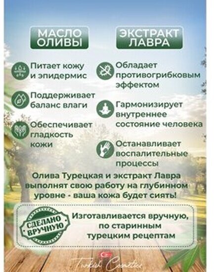 Мыло банное ручной работы изготовлено на основе оливкового масла по лучшим существующим традициям. Оливково-лавровое мыло оказывает омолаживающий эффект, так как содержит витамин Е и антиоксиданты. В результате процесс старения существенно замедляется. Мыло ручной работы помогает снизить скорость появления морщин. Когда уходовое средство для тела начинает контактировать с водой, оливковое мыло образует легкую пенку, которая приятно касается тела.