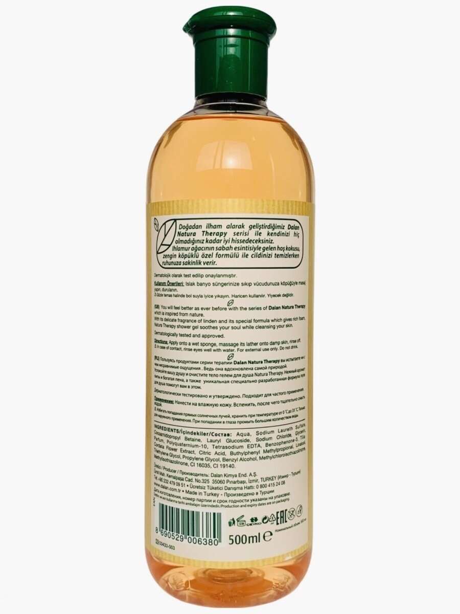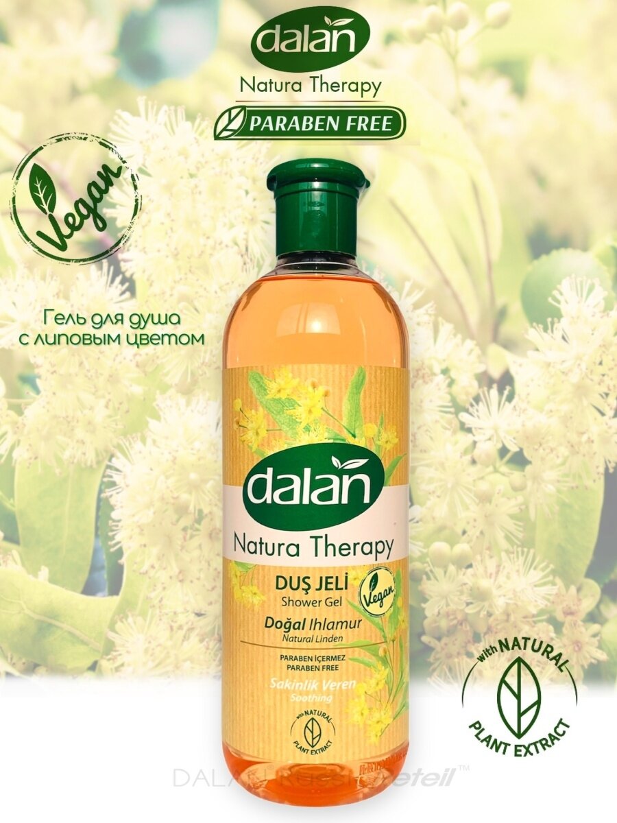 Ощутите на себе заботу природы с турецкими гелями для душа Dalan Natura Therapy "Зеленый Чай", "Липа", "Лаванда". Мягкая и нежная текстура геле этой линейки подарят незабываемые ощущения вашей коже при каждом применении, а густая пена с ароматом чайных листов, душистой лаванды и нежной липы бережно и эффективно удалит любые загрязнения с вашей кожи.Линия косметики Dalan Natura Therapy отличается натуральным составом и приятными ароматами природы. Все средства изготавливаются на основе растительных экстрактов, которые не вызывают раздражения даже на самой нежной коже.Чтобы вернуть своему телу красоту, побалуйте себя натуральной турецкой косметикой. В составе геля - зеленый чай на основе экстракта листьев китайской камелии, лимонен, натуральные отдушки и ароматизаторы, глицерин. В составе "Липы" активные компоненты экстаркта липового цвета и легкие и приятные отдушки липового меда. Лавандовый гель покорит вас насыщенным и ярким ароматом цветка. Все компоненты идеально сочетаются друг с другом, создавая уникальные природный гель, который подходит для очищения даже чувствительной кожи. После регулярного применения косметики Dalan Natura Therapy вы ощутите внутреннее сияние вашей кожи. Если вас заинтересовала другая турецкая эко косметика, то вы можете приобрести в нашем магазине Turkish Cosmetics разнообразные средства для ухода за телом: жидкое мыло, кремы и масла для лица и те?