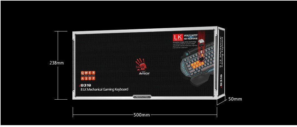 Bloody B318 - самая быстрая игровая клавиатура в мире с механическими переключателями на игровых клавишах. Благодаря инновационной Light Strike технологии скорость отклика клавиатуры составляет всего 0,2 мс. Клавиатура отличается безупречной управляемостью и абсолютной точностью. Идеальное оружие для борьбы с противником! Новые переключатели срабатывают на 30% быстрее, чем обычные механические переключатели. Полный ход клавиш равен 2,2 мм, ход до срабатывания - 1,5 мм.