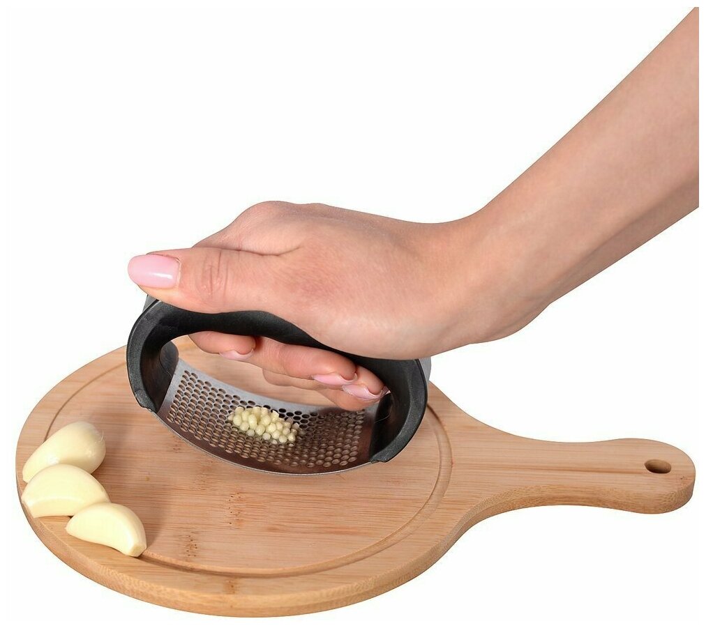 Пресс для чеснока Виват простое и функциональное приспособление для измельчения чеснока. Положите зубчик чеснока на ровную поверхность надавите прессом, слегка покачайте и раздавите его. Перед первым использованием и после каждого применения промыть в проточной воде мягкой щеткой или губкой с жидким моющим средством, просушить. Можно мыть в посудомоечной машине.