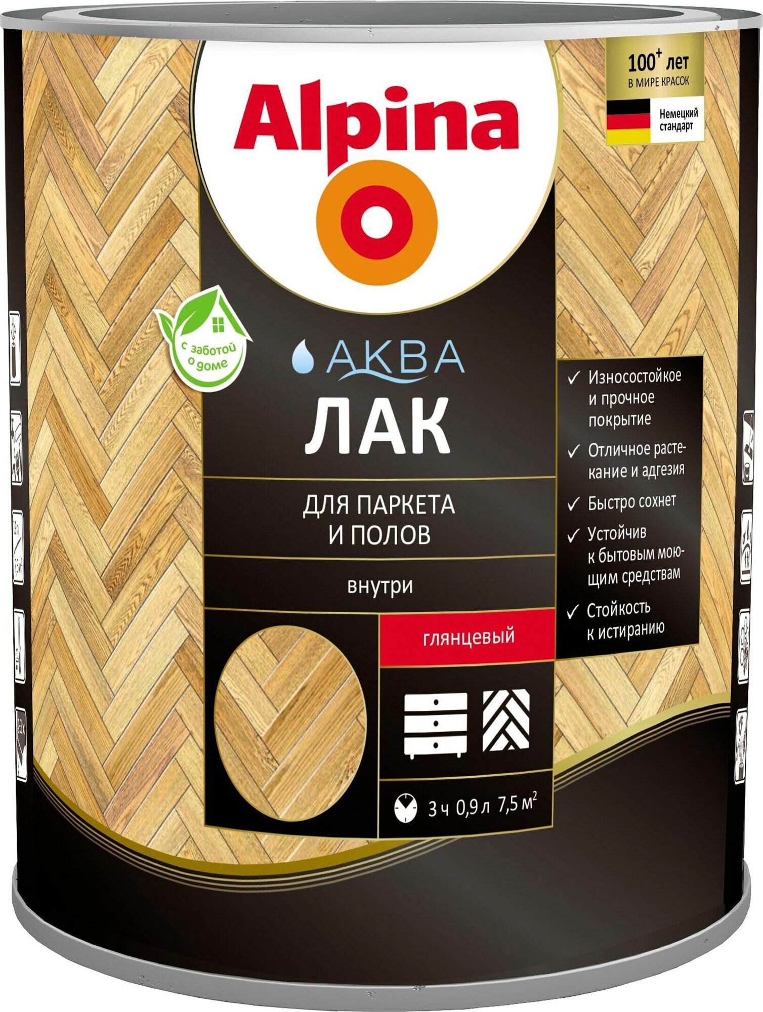 **Лак паркетный Alpina** образует глянцевое покрытие. Предназначен для нанесения внутри помещения. Характеризуется отличной адгезией к деревянным поверхностям и устойчивостью к истиранию, обработке моющими средствами. Для высыхания требуется всего 3 часа. Одной банки достаточно, чтобы обработать до 7,5 м² пола. Поверхность рекомендуется очистить от мусора и грязи. Изготовлен на водно-акриловой основе. Может подвергаться колеровке.