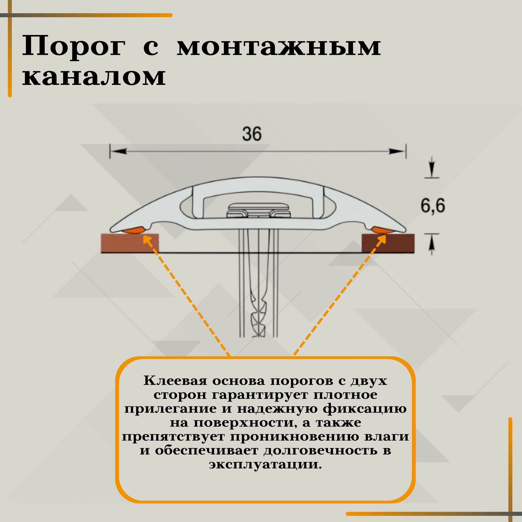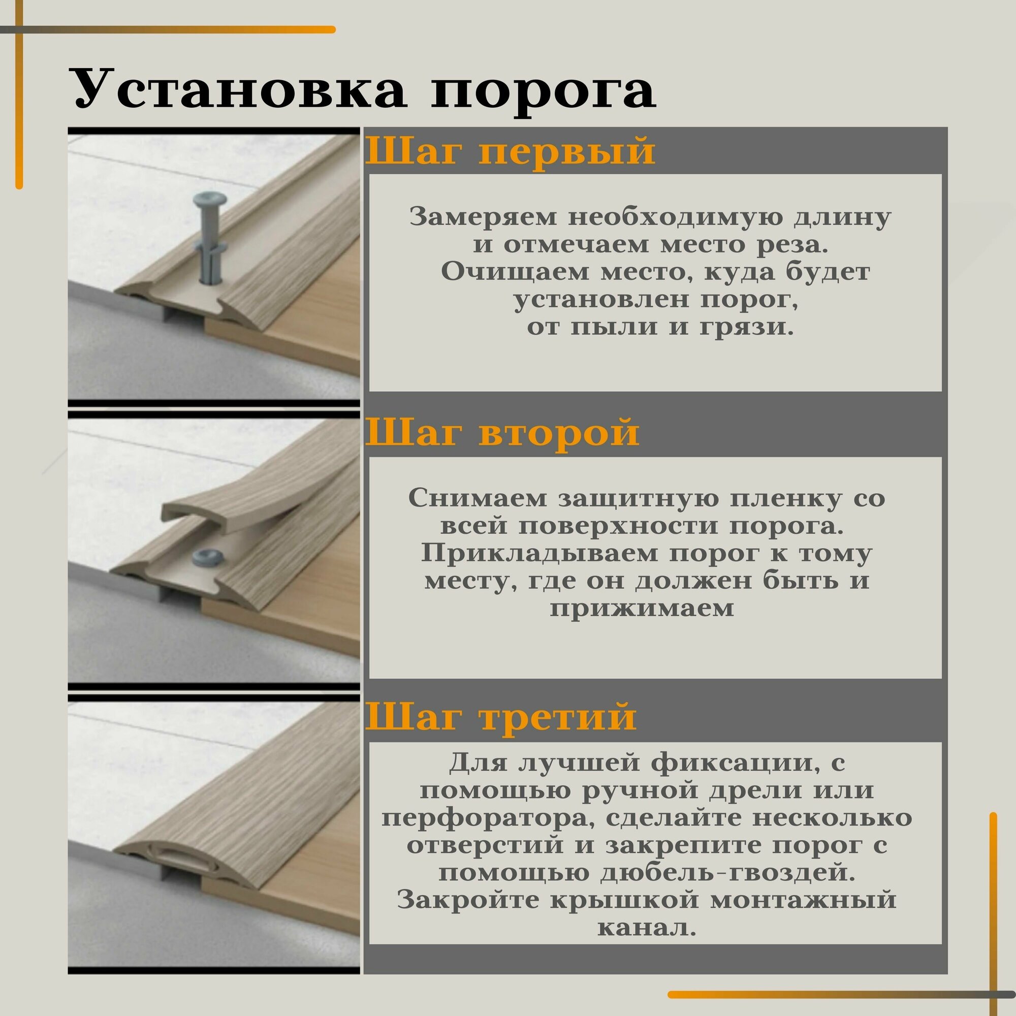 **Стык** или порог одноуровневый предназначен для эстетичного оформления швов между соединительными швами напольного покрытия: ламината, паркета, ковролина, линолеума и т. д. Единственное условие — полотна должны быть расположены на одном уровне. Порог изготовлен из прочного пластика, декорирован под фактуру древесины. Крепится к основанию при помощи шурупов (идет в комплекте).