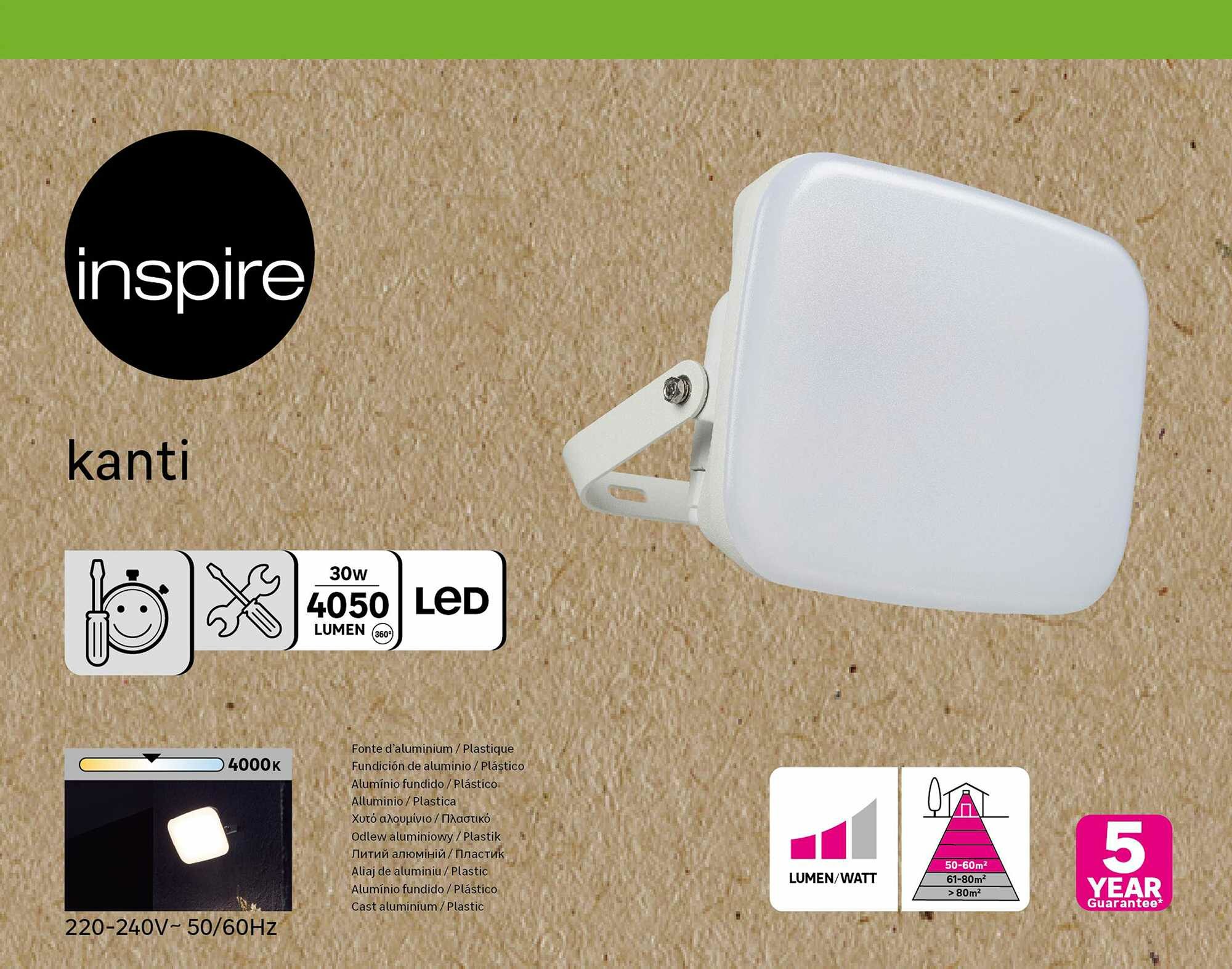 **Прожектор светодиодный уличный Inspire «Kanti»** излучает теплый белый свет. Подходит для монтажа на стены и фасады зданий, сооружений. Световой поток составляет 4050 Лм. Материал изготовления — алюминий, не подверженный коррозии и деформации при контакте с влагой.