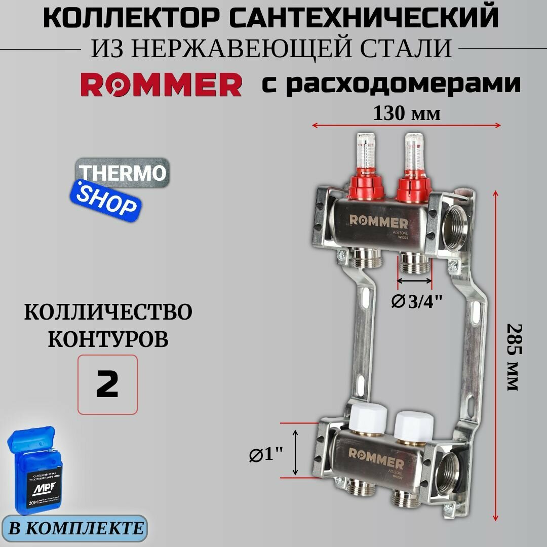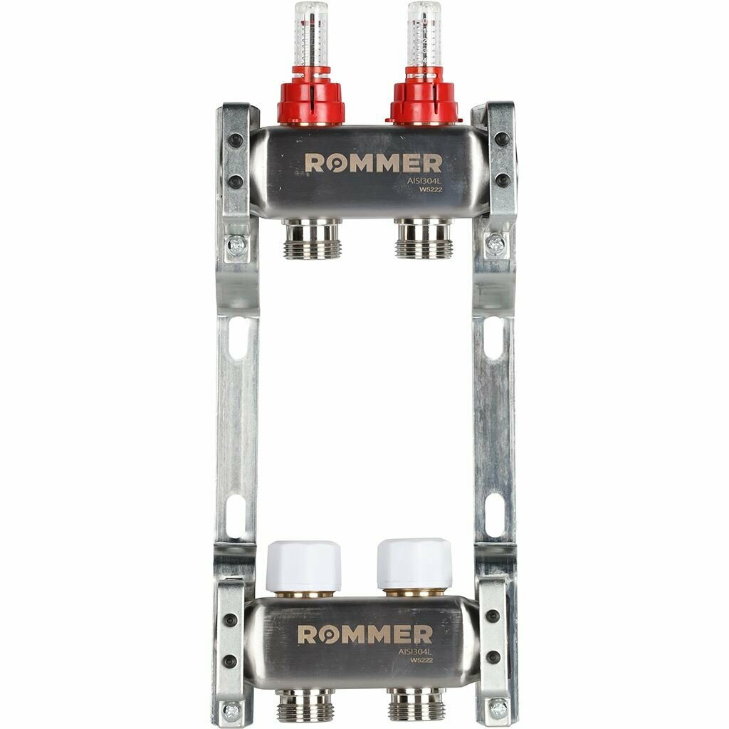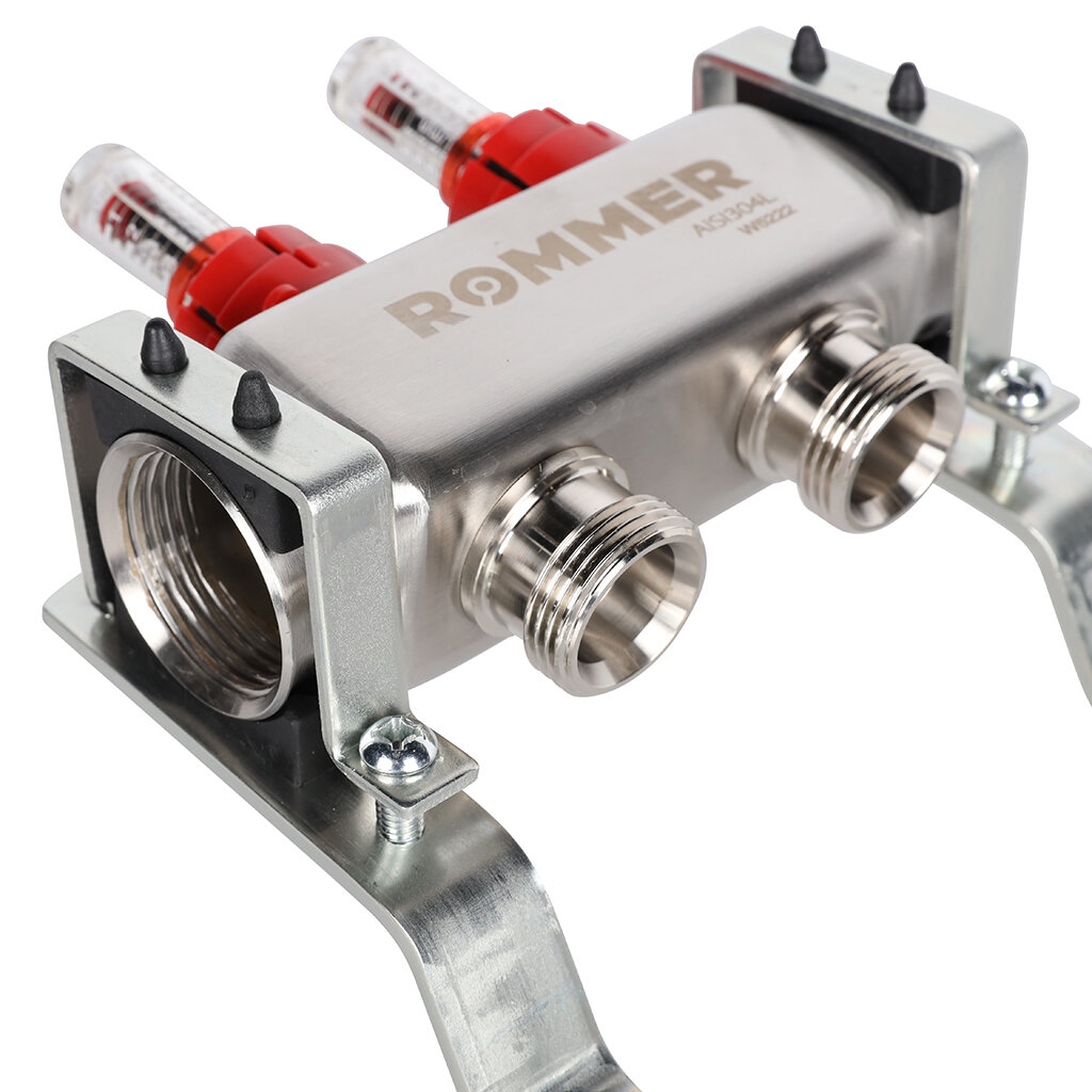 **Коллектор Rommer** используется в системах теплого пола и радиаторного отопления. Служит для разделения потока теплоносителя на несколько контуров. Коллектор снабжен вентилями, позволяющими регулировать величину потока, поступающего в каждый отвод. Предназначен для работы в системе с максимальным давлением 10 бар и температурой теплоносителя 90 °C. Оснащен расходометрами на подающем коллекторе и термостатическими вентилями на обратном.